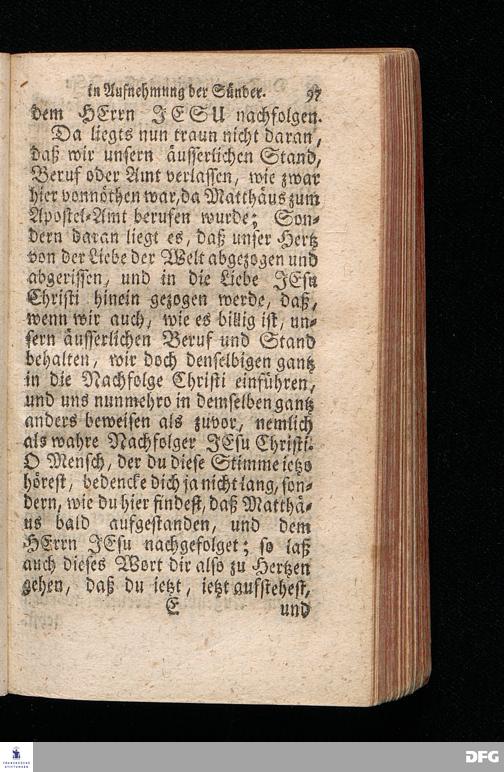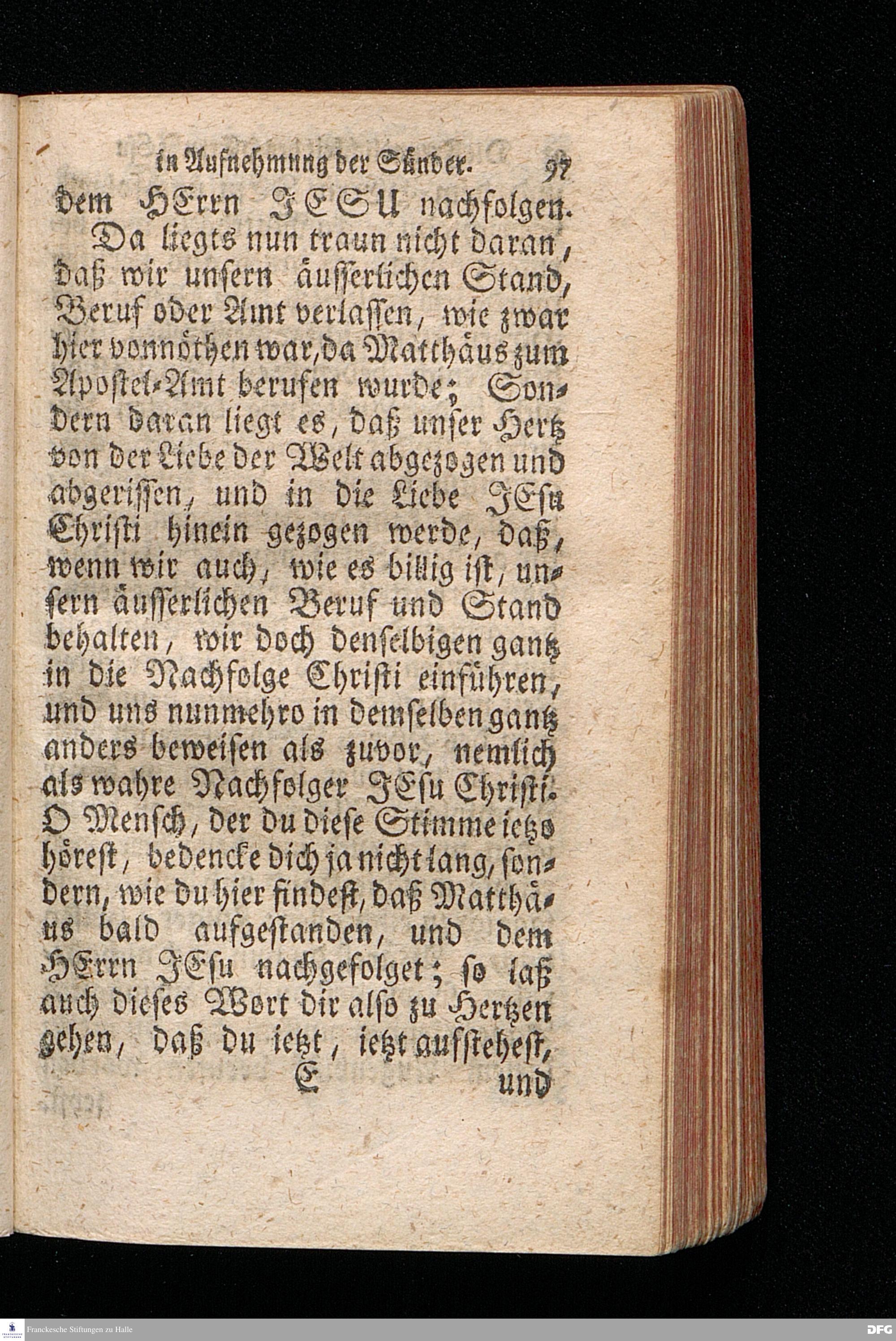 Die Freundlichkeit des HErrn JESU in Aufnehmung der Sünder / Am Tag des Apostels Matthäi 1717. Aus dem ordentlichen Evangelio Matth.IX, 9--13. In der Fürstl.Nassauischen Residentz Idstein bey der damaligen Durchreise in einer auf Verlangen gehaltenen Predigt vorgestellet von August Hermann Francken. [1720]