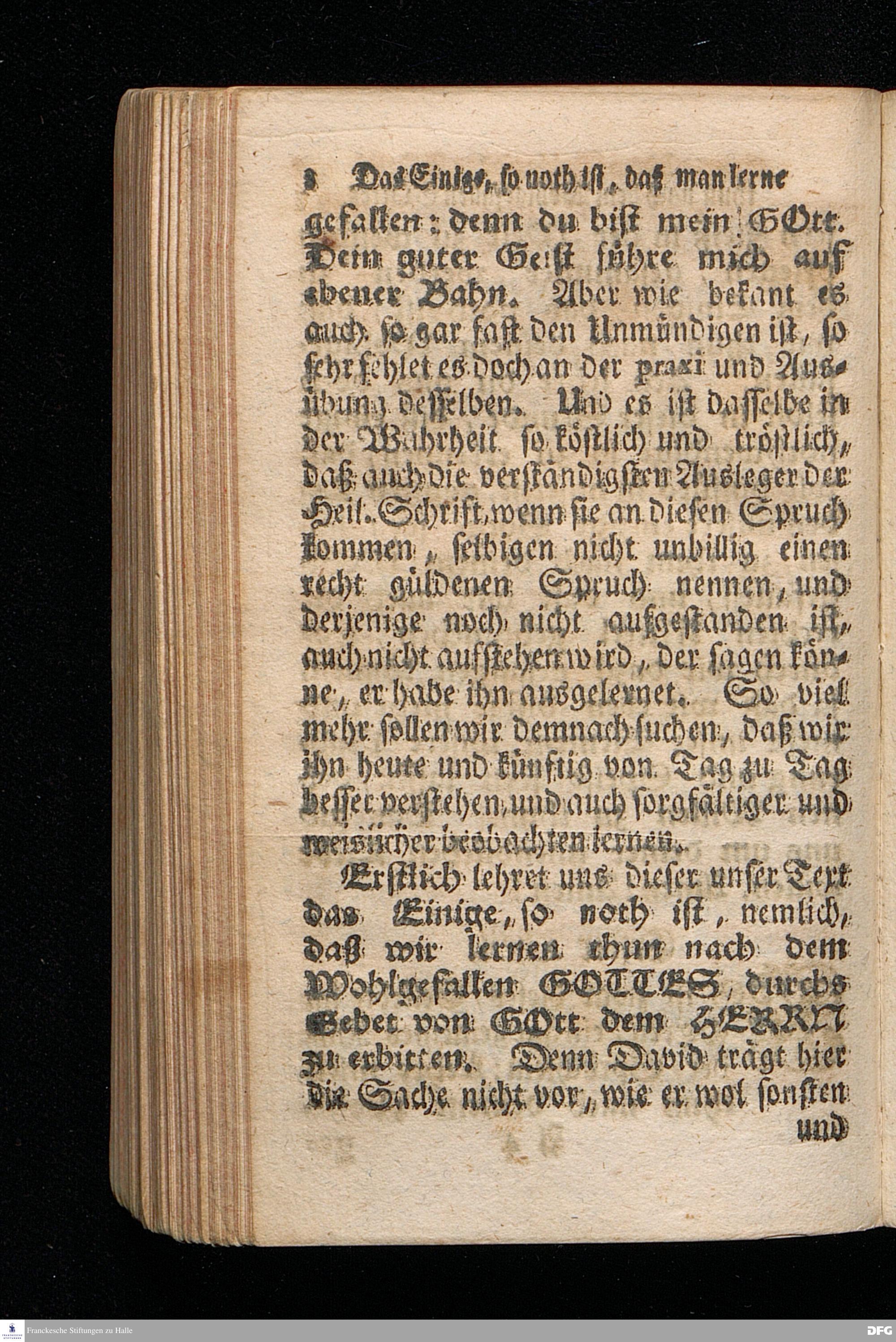 Das Einige, so noth ist, daß man lerne thun nach dem Wohlgefallen GOttes, In einer Am Sonntage Cantate 1721. aus den Worten Ps.143,10. Lehre mich thun nach deinem Wohlgefallen: denn du bist mein GOtt. Dein guter Geist führe mich auf ebener Bahn; Mit Genehmhaltung der Hochlöbl.Theol.Facultät zu Jena in der Collegen=Kirche gehaltenen Predigt vorgestellet von August Herr[!]mann Francken, S.Th.Prof.Past.Vlr.& Gymn.Schol. Andere Auflage. HALLE, in Verlegung des Waysenhauses. 1724.