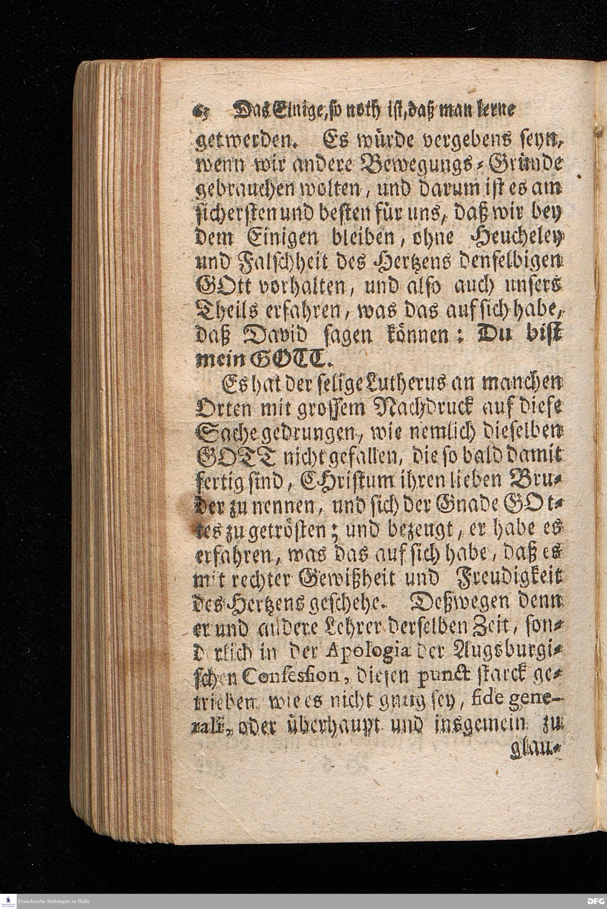 Das Einige, so noth ist, daß man lerne thun nach dem Wohlgefallen GOttes, In einer Am Sonntage Cantate 1721. aus den Worten Ps.143,10. Lehre mich thun nach deinem Wohlgefallen: denn du bist mein GOtt. Dein guter Geist führe mich auf ebener Bahn; Mit Genehmhaltung der Hochlöbl.Theol.Facultät zu Jena in der Collegen=Kirche gehaltenen Predigt vorgestellet von August Herr[!]mann Francken, S.Th.Prof.Past.Vlr.& Gymn.Schol. Andere Auflage. HALLE, in Verlegung des Waysenhauses. 1724.