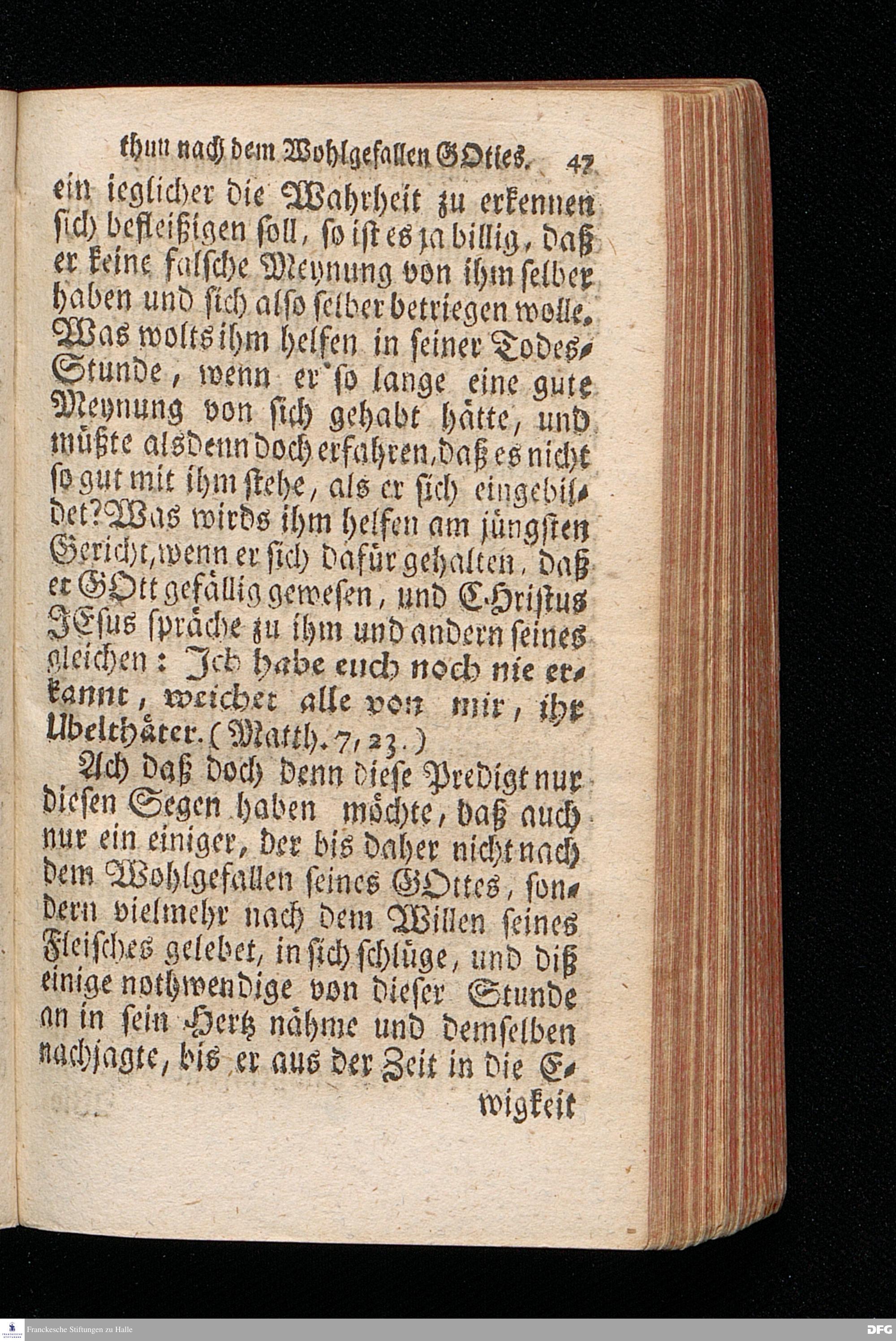 Das Einige, so noth ist, daß man lerne thun nach dem Wohlgefallen GOttes, In einer Am Sonntage Cantate 1721. aus den Worten Ps.143,10. Lehre mich thun nach deinem Wohlgefallen: denn du bist mein GOtt. Dein guter Geist führe mich auf ebener Bahn; Mit Genehmhaltung der Hochlöbl.Theol.Facultät zu Jena in der Collegen=Kirche gehaltenen Predigt vorgestellet von August Herr[!]mann Francken, S.Th.Prof.Past.Vlr.& Gymn.Schol. Andere Auflage. HALLE, in Verlegung des Waysenhauses. 1724.