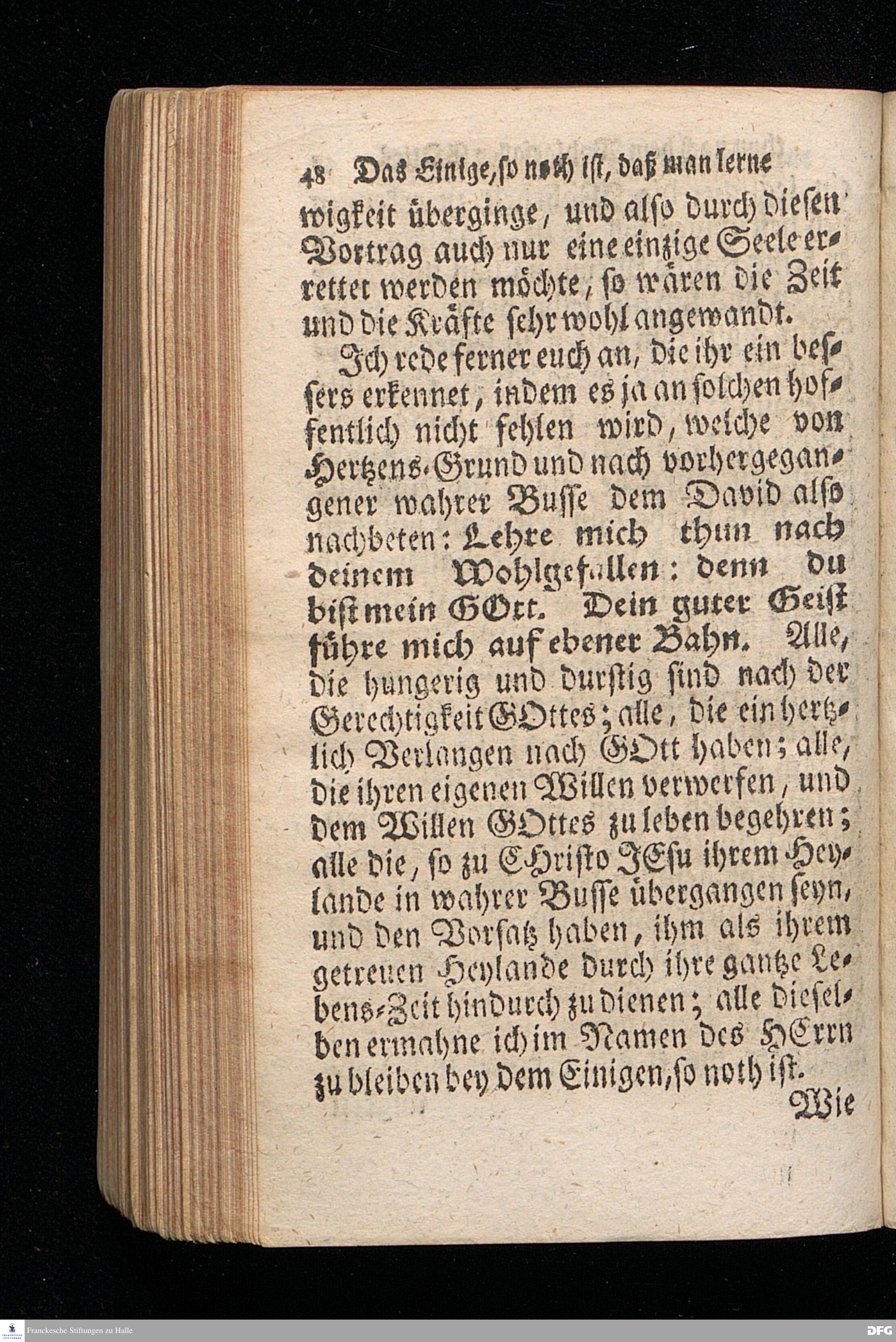 Das Einige, so noth ist, daß man lerne thun nach dem Wohlgefallen GOttes, In einer Am Sonntage Cantate 1721. aus den Worten Ps.143,10. Lehre mich thun nach deinem Wohlgefallen: denn du bist mein GOtt. Dein guter Geist führe mich auf ebener Bahn; Mit Genehmhaltung der Hochlöbl.Theol.Facultät zu Jena in der Collegen=Kirche gehaltenen Predigt vorgestellet von August Herr[!]mann Francken, S.Th.Prof.Past.Vlr.& Gymn.Schol. Andere Auflage. HALLE, in Verlegung des Waysenhauses. 1724.