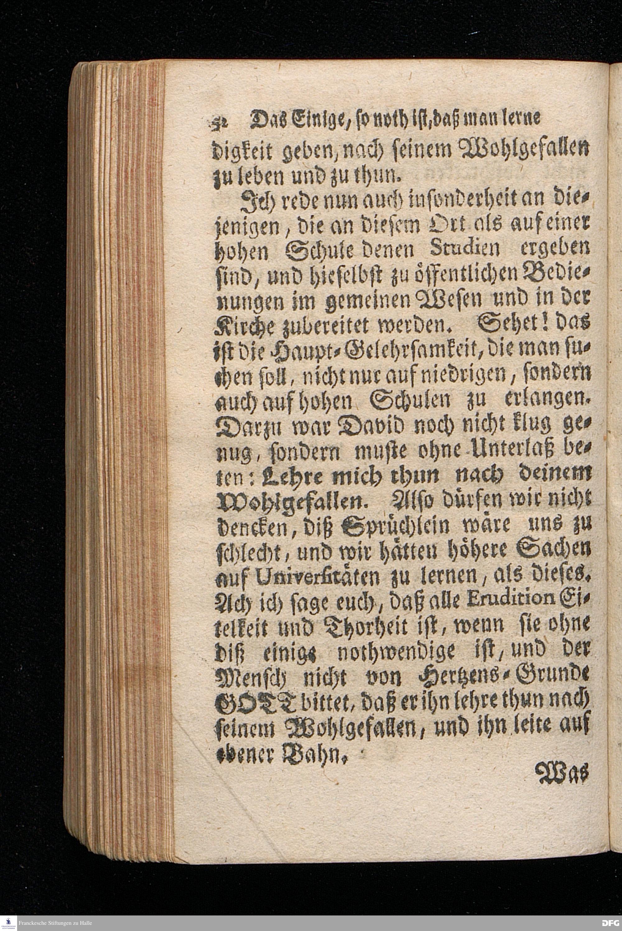 Das Einige, so noth ist, daß man lerne thun nach dem Wohlgefallen GOttes, In einer Am Sonntage Cantate 1721. aus den Worten Ps.143,10. Lehre mich thun nach deinem Wohlgefallen: denn du bist mein GOtt. Dein guter Geist führe mich auf ebener Bahn; Mit Genehmhaltung der Hochlöbl.Theol.Facultät zu Jena in der Collegen=Kirche gehaltenen Predigt vorgestellet von August Herr[!]mann Francken, S.Th.Prof.Past.Vlr.& Gymn.Schol. Andere Auflage. HALLE, in Verlegung des Waysenhauses. 1724.