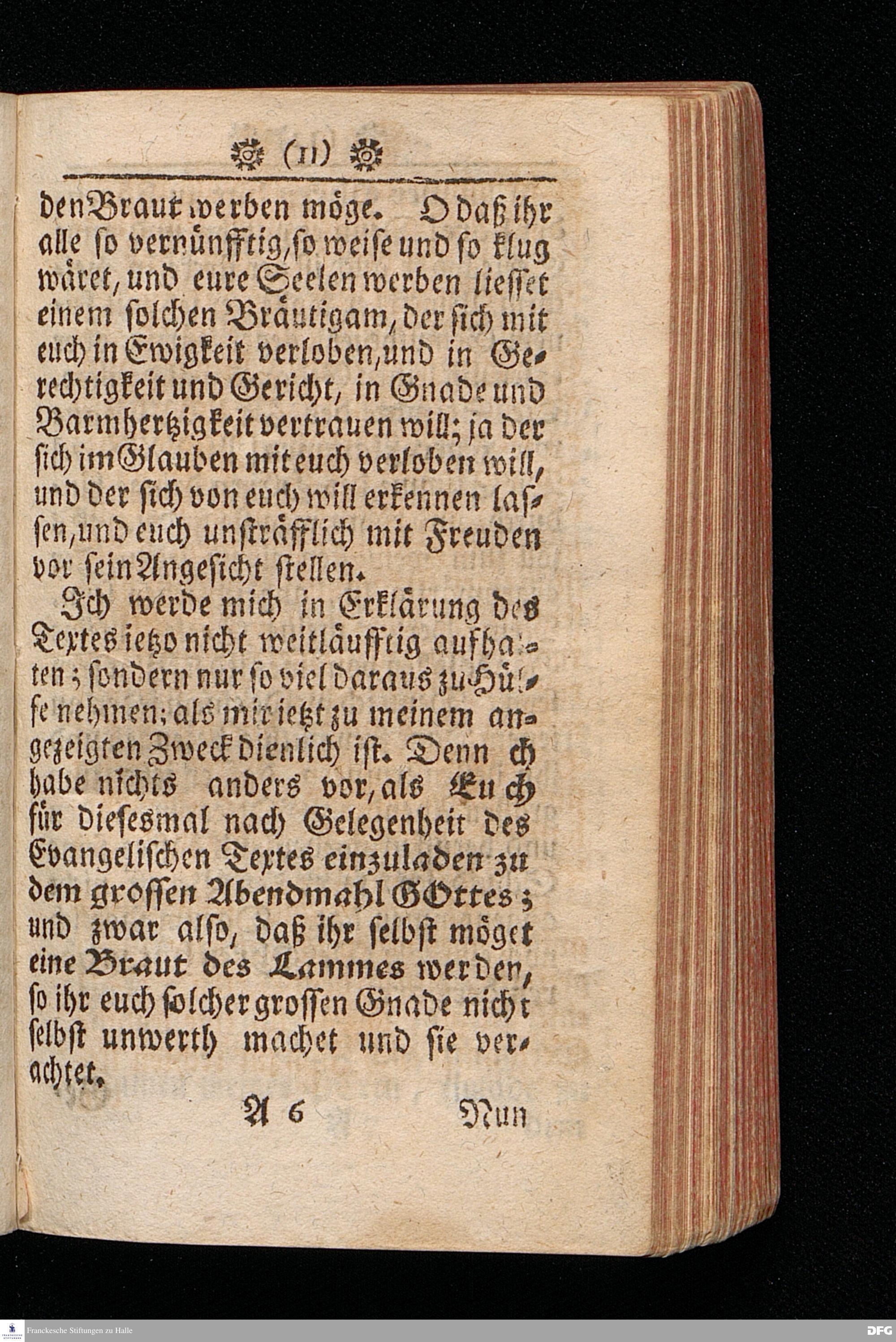 Die Einladung zu dem grossen Abendmahl GOttes, Aus Luc.XIV, 16-24. In einer zu Halle in der Schul=Kirche Am II.Sonntag nach Trinit. Anno 1709. gehaltenen Predigt vorgetragen von August Hermann Francken / S.Th.Prof.Past.Vlr.& Gymn.Schol. Andere Auflage. HALLE, Im Wäysen=Hause, 1723.