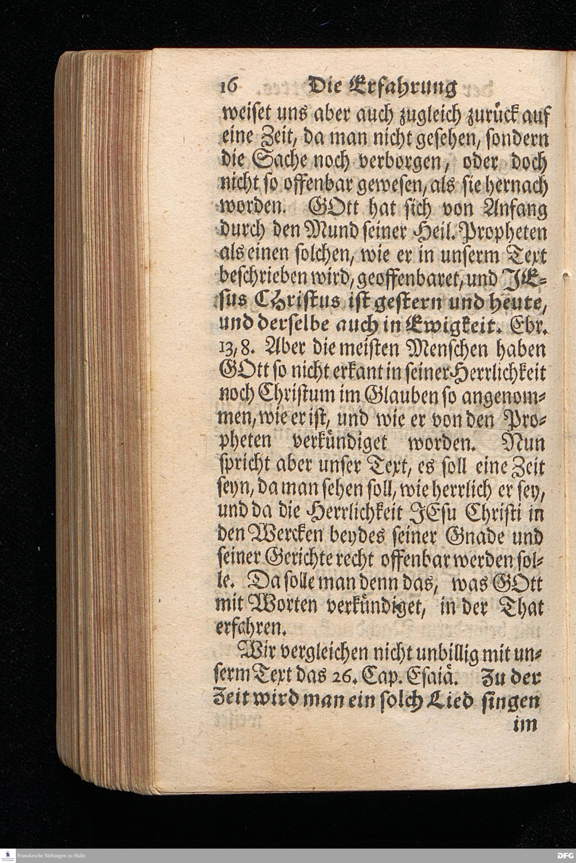Die Erfahrung Der Herrlichkeit GOttes, Aus dem 5 Buch Mosis XXXII, 39.40. [Bibelzitat.] Am Buß=Tage den 2.Sept.1716. In der St.Ulrichs=Kirche in Halle vorgestellet von August Hermann Francken / S.Th.Prof.& Past.Vlr.& Schol. Der Jugend in den Schulen des Wäysenhauses / nach gehaltenem Examine, den 7.Nov.gedachten Jahres ausgetheilet. Andere Auflage. Halle, zu finden im Wäysen=Hause 1730.