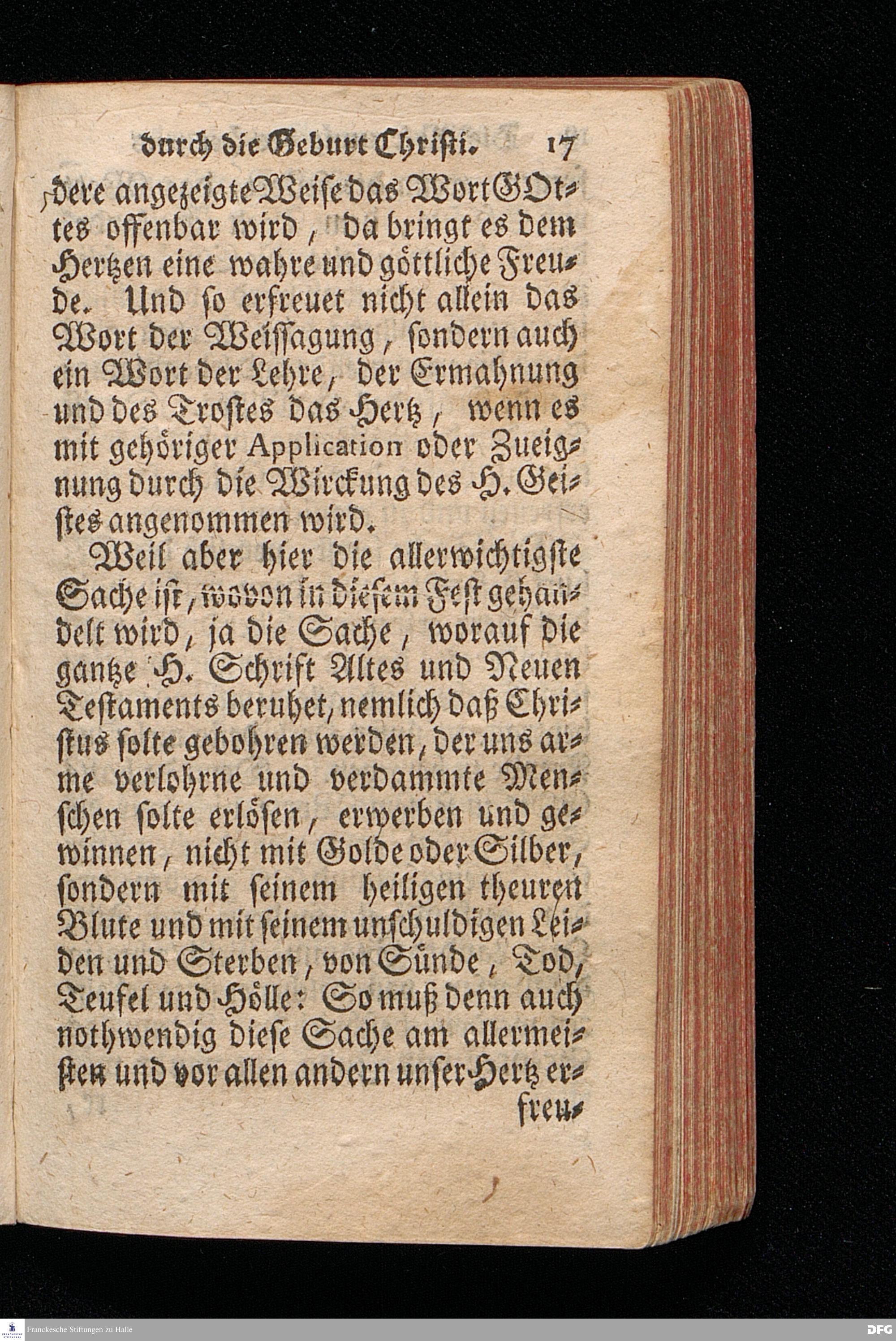 Die Erfreuung des Menschlichen Hertzens Durch die Geburt CHRISTI / Am I.Christ=Tage An.1717. In einer Uber den ordentlichen Evangelischen Text Luc.II, 1--14. In der Stadt=Kirchen zu Blaubeuren im Hertzogthum Würtemberg, Auf Erfordern Sr.Hochwürden des jetzigen Herrn Prälaten und gantzen Ministerii daselbst, gehaltenen Predigt vorgestellet Und auf Begehren zum Druck gegeben von August Hermann Francken / S.Theol.Prof.Past.und Scholarcha in Halle im Hertzogthum Magdeburg. Dritte Auflage / Nach dem zu Ulm gedruckten Exemplar. HALLE, gedruckt im Wäysen=Hause. 1719.