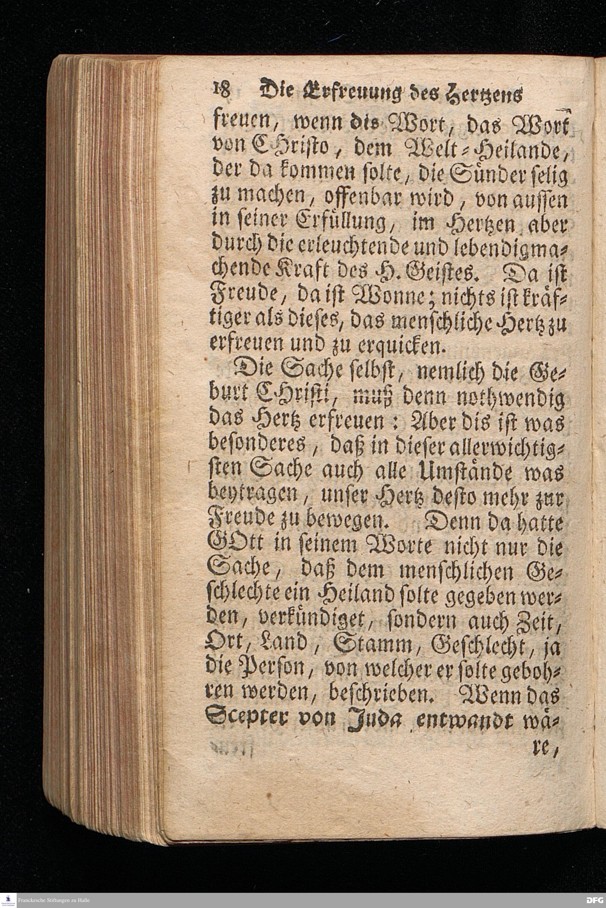 Die Erfreuung des Menschlichen Hertzens Durch die Geburt CHRISTI / Am I.Christ=Tage An.1717. In einer Uber den ordentlichen Evangelischen Text Luc.II, 1--14. In der Stadt=Kirchen zu Blaubeuren im Hertzogthum Würtemberg, Auf Erfordern Sr.Hochwürden des jetzigen Herrn Prälaten und gantzen Ministerii daselbst, gehaltenen Predigt vorgestellet Und auf Begehren zum Druck gegeben von August Hermann Francken / S.Theol.Prof.Past.und Scholarcha in Halle im Hertzogthum Magdeburg. Dritte Auflage / Nach dem zu Ulm gedruckten Exemplar. HALLE, gedruckt im Wäysen=Hause. 1719.