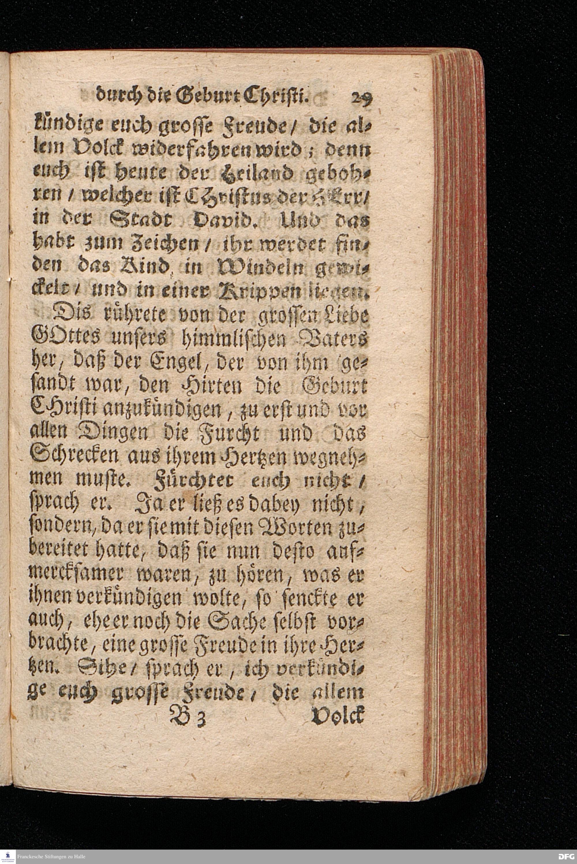 Die Erfreuung des Menschlichen Hertzens Durch die Geburt CHRISTI / Am I.Christ=Tage An.1717. In einer Uber den ordentlichen Evangelischen Text Luc.II, 1--14. In der Stadt=Kirchen zu Blaubeuren im Hertzogthum Würtemberg, Auf Erfordern Sr.Hochwürden des jetzigen Herrn Prälaten und gantzen Ministerii daselbst, gehaltenen Predigt vorgestellet Und auf Begehren zum Druck gegeben von August Hermann Francken / S.Theol.Prof.Past.und Scholarcha in Halle im Hertzogthum Magdeburg. Dritte Auflage / Nach dem zu Ulm gedruckten Exemplar. HALLE, gedruckt im Wäysen=Hause. 1719.