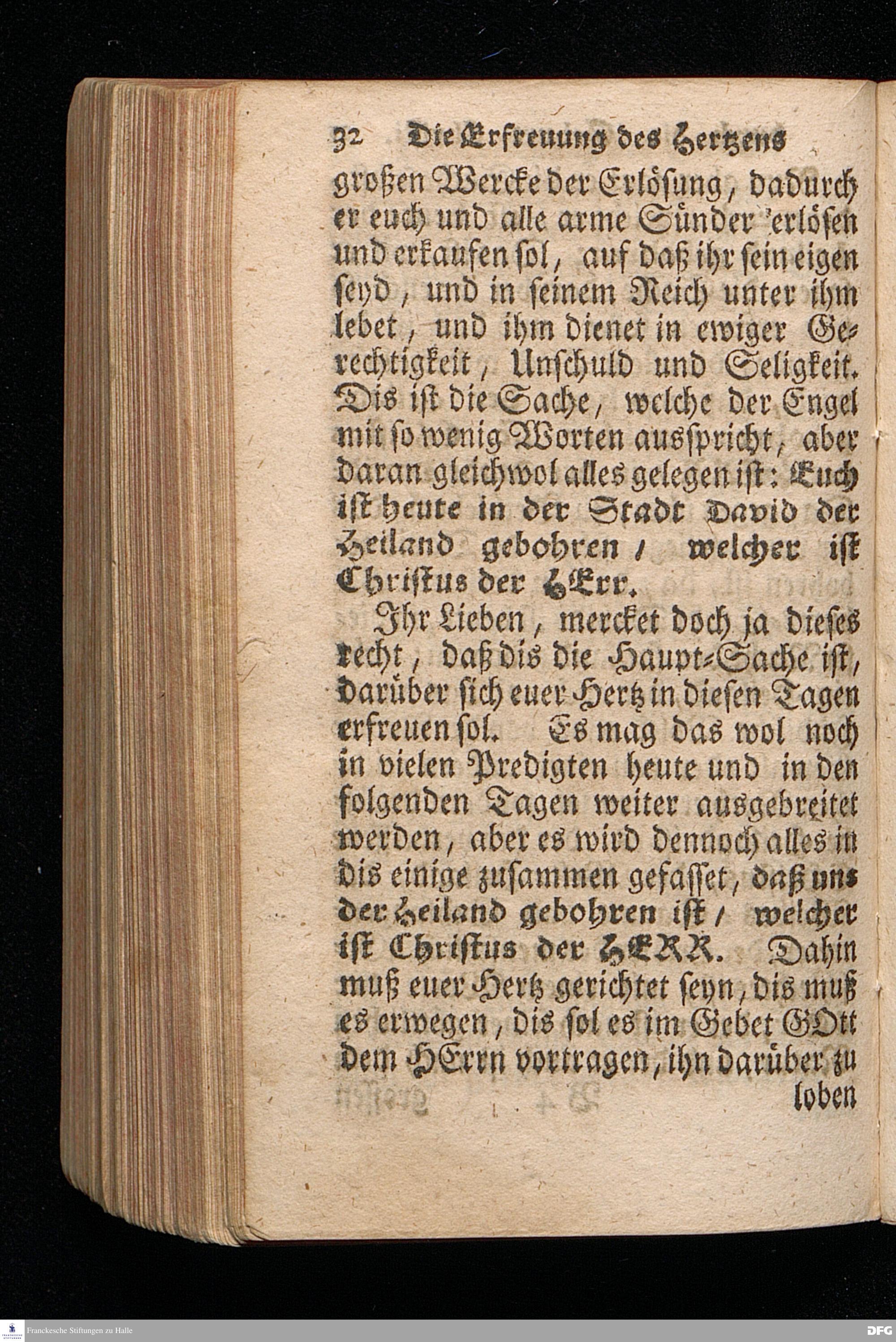 Die Erfreuung des Menschlichen Hertzens Durch die Geburt CHRISTI / Am I.Christ=Tage An.1717. In einer Uber den ordentlichen Evangelischen Text Luc.II, 1--14. In der Stadt=Kirchen zu Blaubeuren im Hertzogthum Würtemberg, Auf Erfordern Sr.Hochwürden des jetzigen Herrn Prälaten und gantzen Ministerii daselbst, gehaltenen Predigt vorgestellet Und auf Begehren zum Druck gegeben von August Hermann Francken / S.Theol.Prof.Past.und Scholarcha in Halle im Hertzogthum Magdeburg. Dritte Auflage / Nach dem zu Ulm gedruckten Exemplar. HALLE, gedruckt im Wäysen=Hause. 1719.