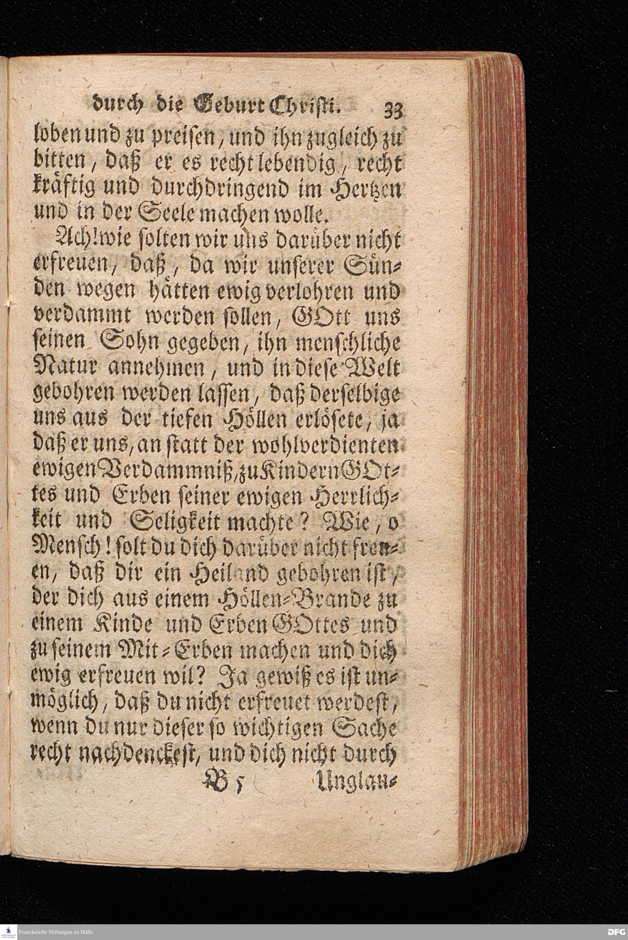 Die Erfreuung des Menschlichen Hertzens Durch die Geburt CHRISTI / Am I.Christ=Tage An.1717. In einer Uber den ordentlichen Evangelischen Text Luc.II, 1--14. In der Stadt=Kirchen zu Blaubeuren im Hertzogthum Würtemberg, Auf Erfordern Sr.Hochwürden des jetzigen Herrn Prälaten und gantzen Ministerii daselbst, gehaltenen Predigt vorgestellet Und auf Begehren zum Druck gegeben von August Hermann Francken / S.Theol.Prof.Past.und Scholarcha in Halle im Hertzogthum Magdeburg. Dritte Auflage / Nach dem zu Ulm gedruckten Exemplar. HALLE, gedruckt im Wäysen=Hause. 1719.
