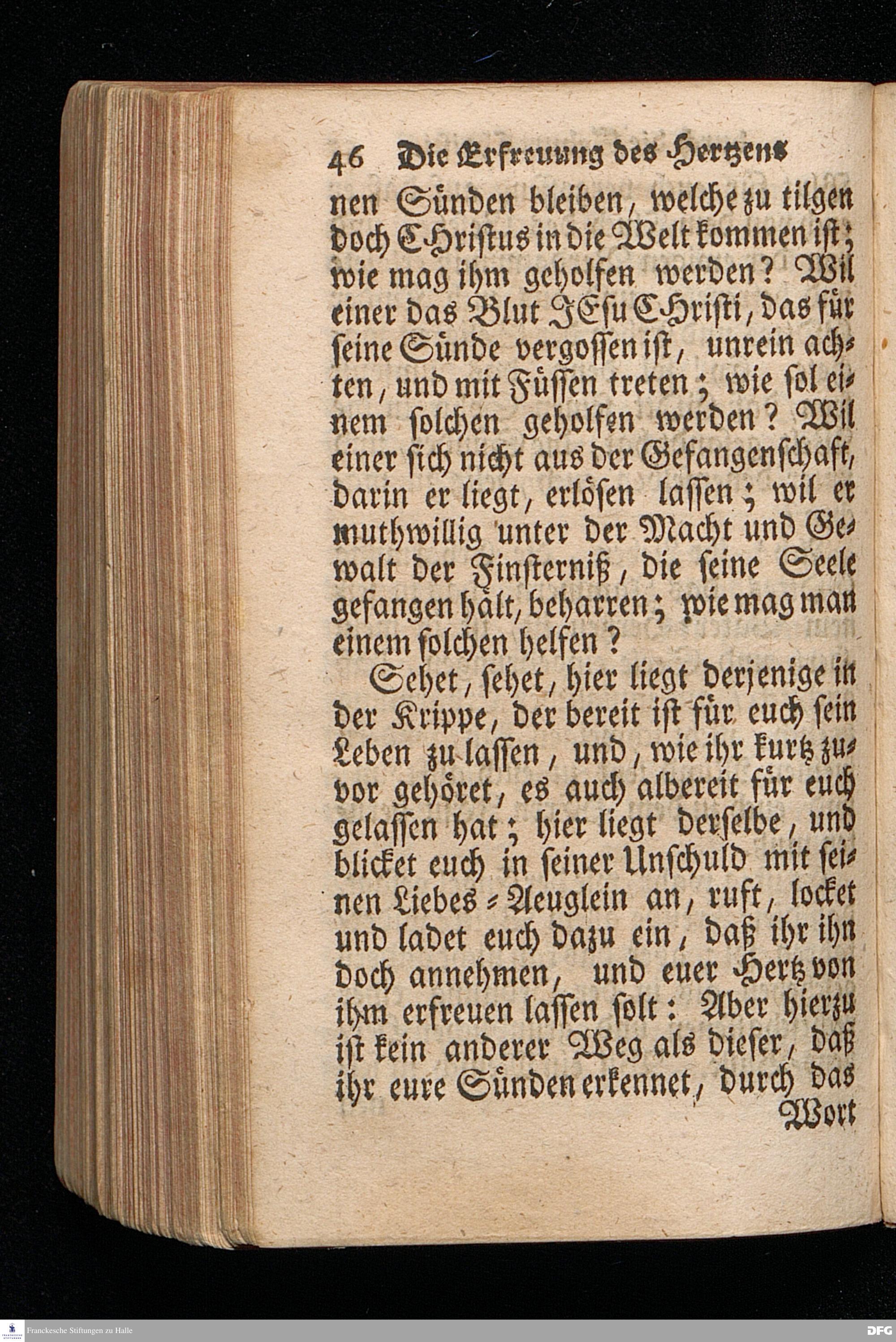 Die Erfreuung des Menschlichen Hertzens Durch die Geburt CHRISTI / Am I.Christ=Tage An.1717. In einer Uber den ordentlichen Evangelischen Text Luc.II, 1--14. In der Stadt=Kirchen zu Blaubeuren im Hertzogthum Würtemberg, Auf Erfordern Sr.Hochwürden des jetzigen Herrn Prälaten und gantzen Ministerii daselbst, gehaltenen Predigt vorgestellet Und auf Begehren zum Druck gegeben von August Hermann Francken / S.Theol.Prof.Past.und Scholarcha in Halle im Hertzogthum Magdeburg. Dritte Auflage / Nach dem zu Ulm gedruckten Exemplar. HALLE, gedruckt im Wäysen=Hause. 1719.