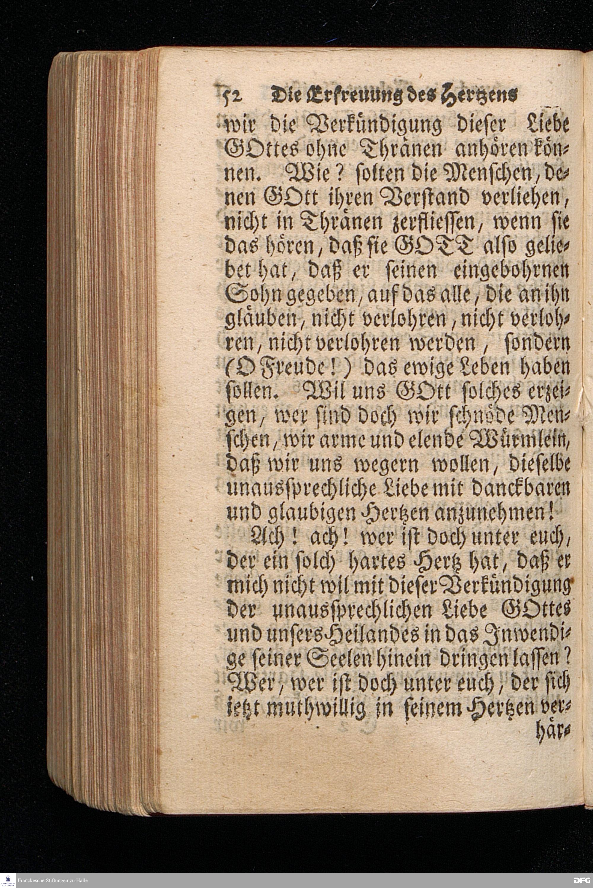 Die Erfreuung des Menschlichen Hertzens Durch die Geburt CHRISTI / Am I.Christ=Tage An.1717. In einer Uber den ordentlichen Evangelischen Text Luc.II, 1--14. In der Stadt=Kirchen zu Blaubeuren im Hertzogthum Würtemberg, Auf Erfordern Sr.Hochwürden des jetzigen Herrn Prälaten und gantzen Ministerii daselbst, gehaltenen Predigt vorgestellet Und auf Begehren zum Druck gegeben von August Hermann Francken / S.Theol.Prof.Past.und Scholarcha in Halle im Hertzogthum Magdeburg. Dritte Auflage / Nach dem zu Ulm gedruckten Exemplar. HALLE, gedruckt im Wäysen=Hause. 1719.