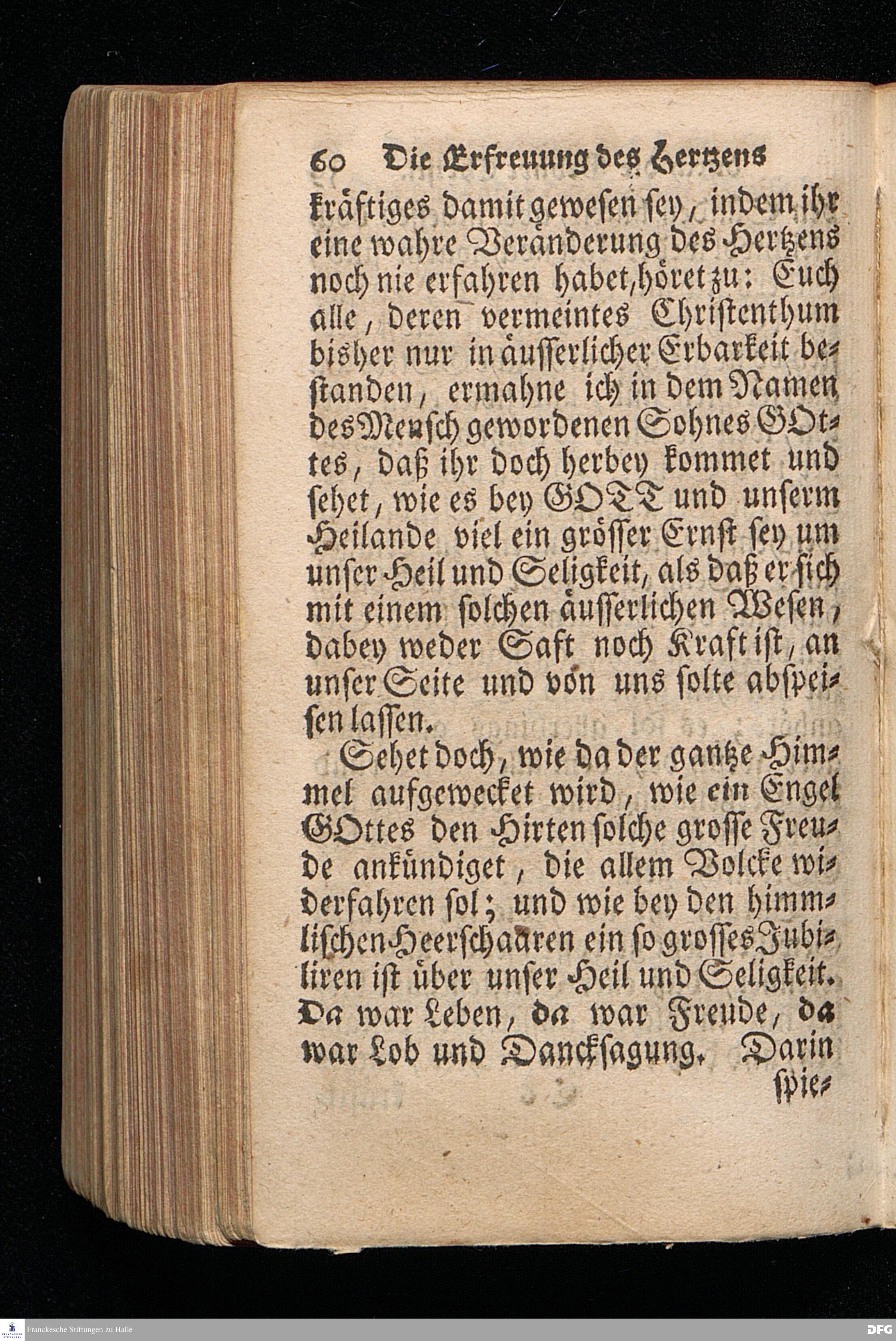 Die Erfreuung des Menschlichen Hertzens Durch die Geburt CHRISTI / Am I.Christ=Tage An.1717. In einer Uber den ordentlichen Evangelischen Text Luc.II, 1--14. In der Stadt=Kirchen zu Blaubeuren im Hertzogthum Würtemberg, Auf Erfordern Sr.Hochwürden des jetzigen Herrn Prälaten und gantzen Ministerii daselbst, gehaltenen Predigt vorgestellet Und auf Begehren zum Druck gegeben von August Hermann Francken / S.Theol.Prof.Past.und Scholarcha in Halle im Hertzogthum Magdeburg. Dritte Auflage / Nach dem zu Ulm gedruckten Exemplar. HALLE, gedruckt im Wäysen=Hause. 1719.