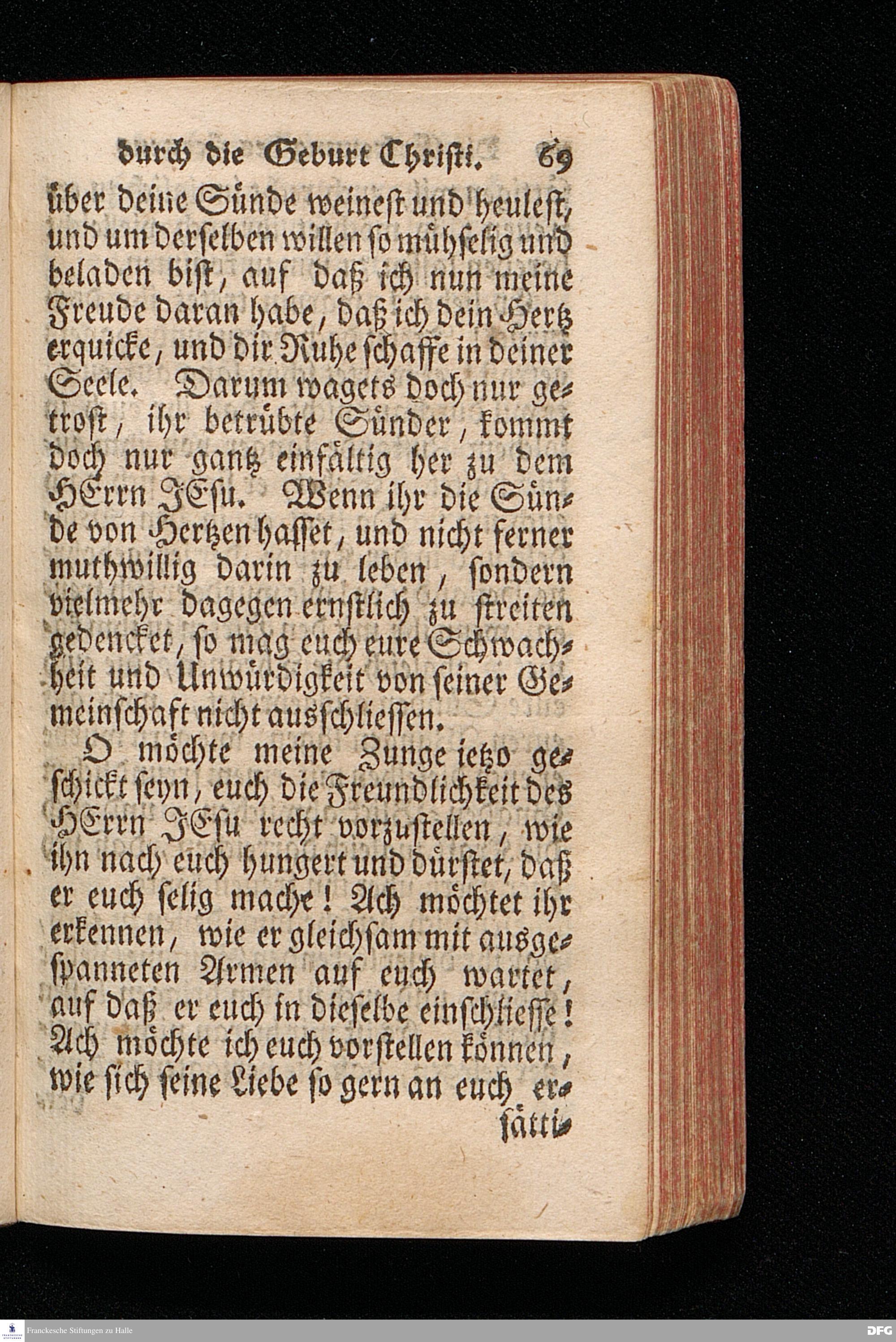 Die Erfreuung des Menschlichen Hertzens Durch die Geburt CHRISTI / Am I.Christ=Tage An.1717. In einer Uber den ordentlichen Evangelischen Text Luc.II, 1--14. In der Stadt=Kirchen zu Blaubeuren im Hertzogthum Würtemberg, Auf Erfordern Sr.Hochwürden des jetzigen Herrn Prälaten und gantzen Ministerii daselbst, gehaltenen Predigt vorgestellet Und auf Begehren zum Druck gegeben von August Hermann Francken / S.Theol.Prof.Past.und Scholarcha in Halle im Hertzogthum Magdeburg. Dritte Auflage / Nach dem zu Ulm gedruckten Exemplar. HALLE, gedruckt im Wäysen=Hause. 1719.