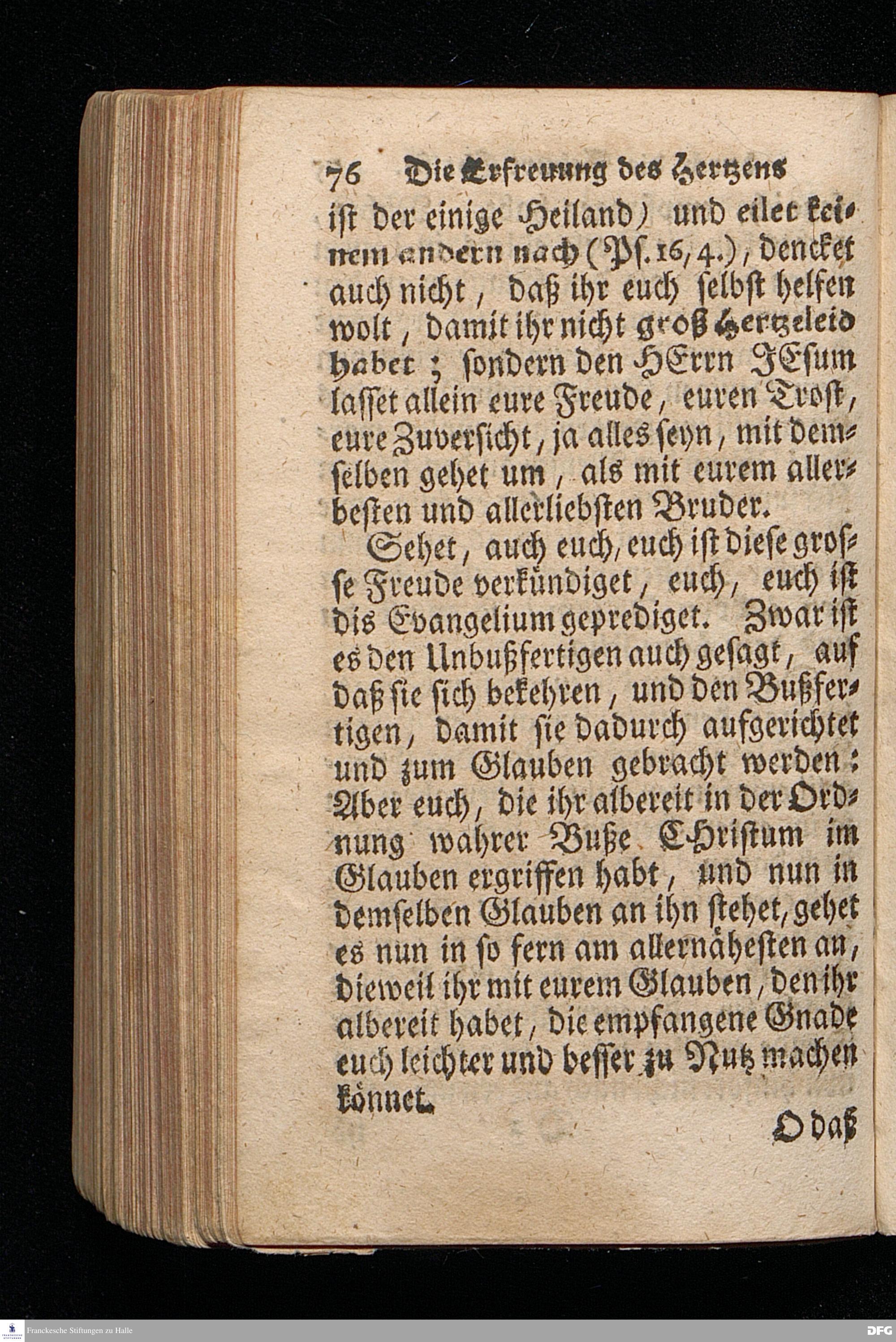 Die Erfreuung des Menschlichen Hertzens Durch die Geburt CHRISTI / Am I.Christ=Tage An.1717. In einer Uber den ordentlichen Evangelischen Text Luc.II, 1--14. In der Stadt=Kirchen zu Blaubeuren im Hertzogthum Würtemberg, Auf Erfordern Sr.Hochwürden des jetzigen Herrn Prälaten und gantzen Ministerii daselbst, gehaltenen Predigt vorgestellet Und auf Begehren zum Druck gegeben von August Hermann Francken / S.Theol.Prof.Past.und Scholarcha in Halle im Hertzogthum Magdeburg. Dritte Auflage / Nach dem zu Ulm gedruckten Exemplar. HALLE, gedruckt im Wäysen=Hause. 1719.