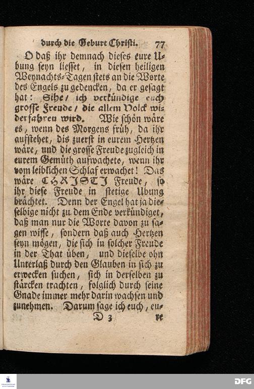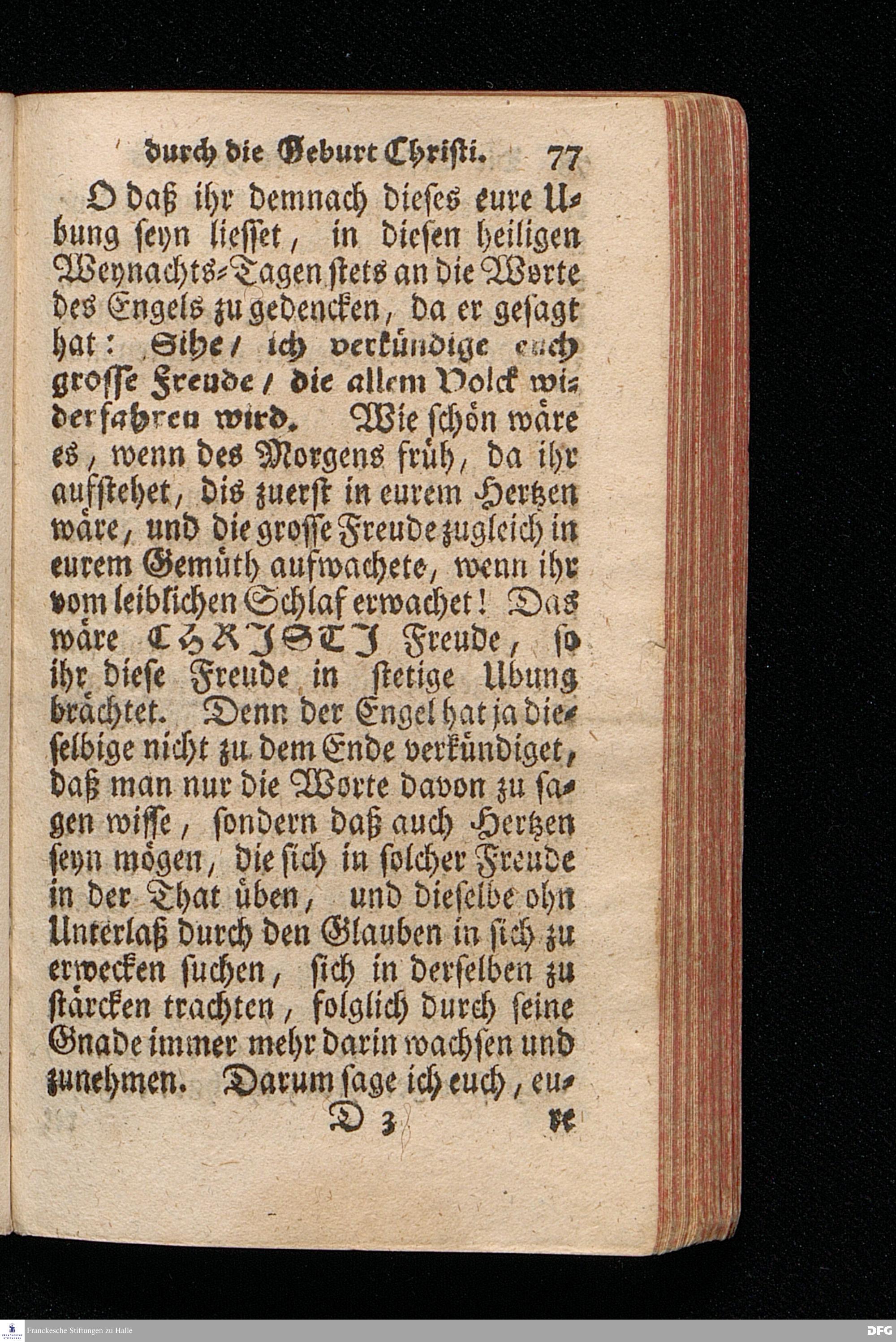 Die Erfreuung des Menschlichen Hertzens Durch die Geburt CHRISTI / Am I.Christ=Tage An.1717. In einer Uber den ordentlichen Evangelischen Text Luc.II, 1--14. In der Stadt=Kirchen zu Blaubeuren im Hertzogthum Würtemberg, Auf Erfordern Sr.Hochwürden des jetzigen Herrn Prälaten und gantzen Ministerii daselbst, gehaltenen Predigt vorgestellet Und auf Begehren zum Druck gegeben von August Hermann Francken / S.Theol.Prof.Past.und Scholarcha in Halle im Hertzogthum Magdeburg. Dritte Auflage / Nach dem zu Ulm gedruckten Exemplar. HALLE, gedruckt im Wäysen=Hause. 1719.