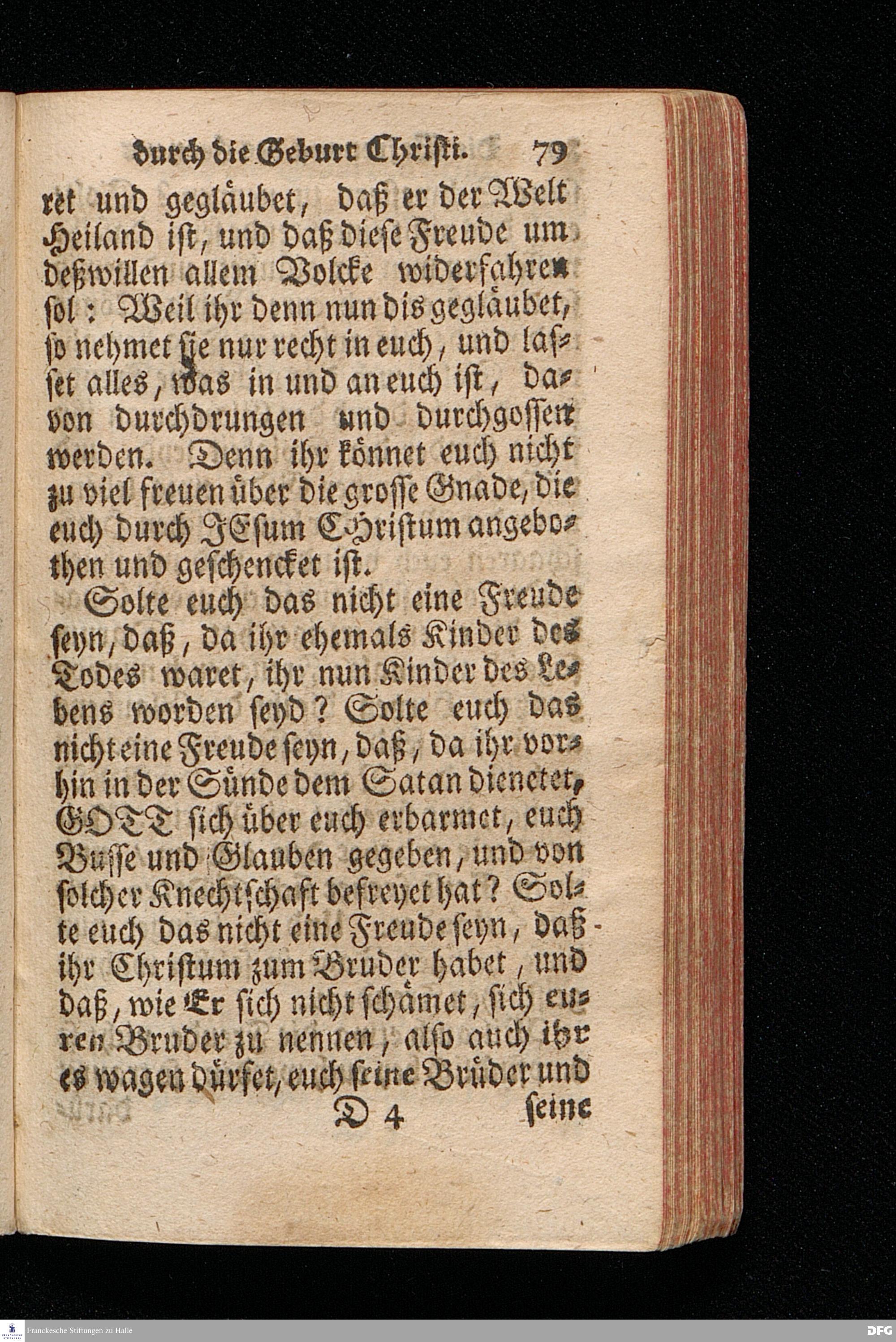 Die Erfreuung des Menschlichen Hertzens Durch die Geburt CHRISTI / Am I.Christ=Tage An.1717. In einer Uber den ordentlichen Evangelischen Text Luc.II, 1--14. In der Stadt=Kirchen zu Blaubeuren im Hertzogthum Würtemberg, Auf Erfordern Sr.Hochwürden des jetzigen Herrn Prälaten und gantzen Ministerii daselbst, gehaltenen Predigt vorgestellet Und auf Begehren zum Druck gegeben von August Hermann Francken / S.Theol.Prof.Past.und Scholarcha in Halle im Hertzogthum Magdeburg. Dritte Auflage / Nach dem zu Ulm gedruckten Exemplar. HALLE, gedruckt im Wäysen=Hause. 1719.