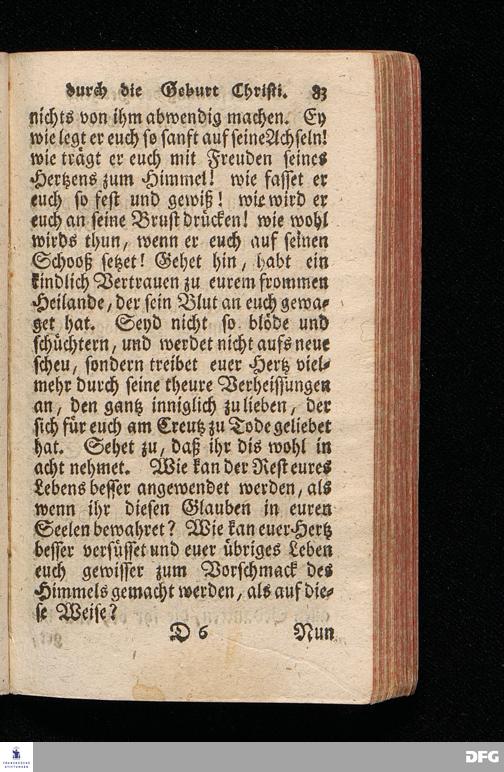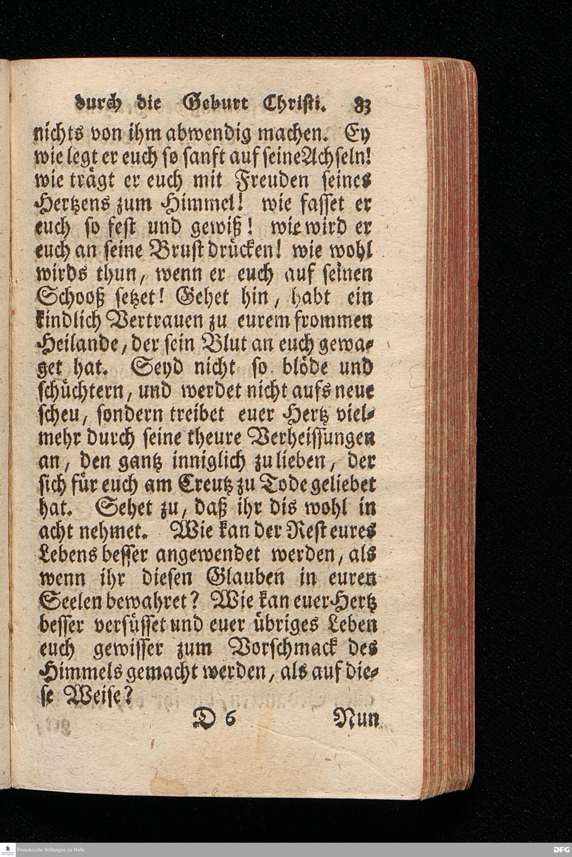 Die Erfreuung des Menschlichen Hertzens Durch die Geburt CHRISTI / Am I.Christ=Tage An.1717. In einer Uber den ordentlichen Evangelischen Text Luc.II, 1--14. In der Stadt=Kirchen zu Blaubeuren im Hertzogthum Würtemberg, Auf Erfordern Sr.Hochwürden des jetzigen Herrn Prälaten und gantzen Ministerii daselbst, gehaltenen Predigt vorgestellet Und auf Begehren zum Druck gegeben von August Hermann Francken / S.Theol.Prof.Past.und Scholarcha in Halle im Hertzogthum Magdeburg. Dritte Auflage / Nach dem zu Ulm gedruckten Exemplar. HALLE, gedruckt im Wäysen=Hause. 1719.