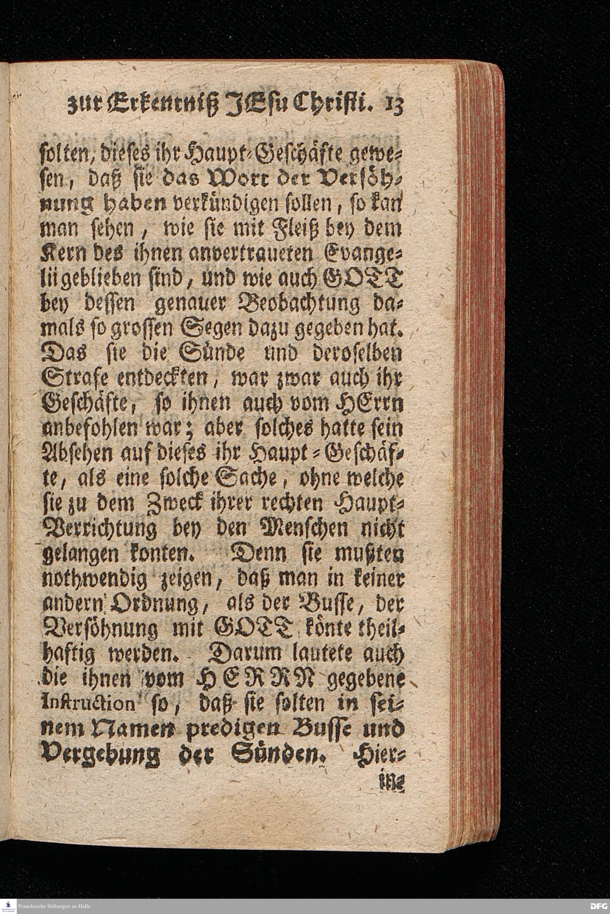 Kurtze Anweisung zur wahren, lauteren und Apostolischen Erkentniß JEsu CHristi; Da In zehen Puncten / wie dieselbe nach dem Sinn und der Lehr=Art der Apostel richtig und nachdrücklich zum wahren Heyl der Seelen zu fassen sey / gezeiget wird Von August Hermann Francken / S.Theol.Prof.Ord.& Past.Ulr. Vierte Auflage. HALLE, in Verlegung des Wäysenhauses. 1728.