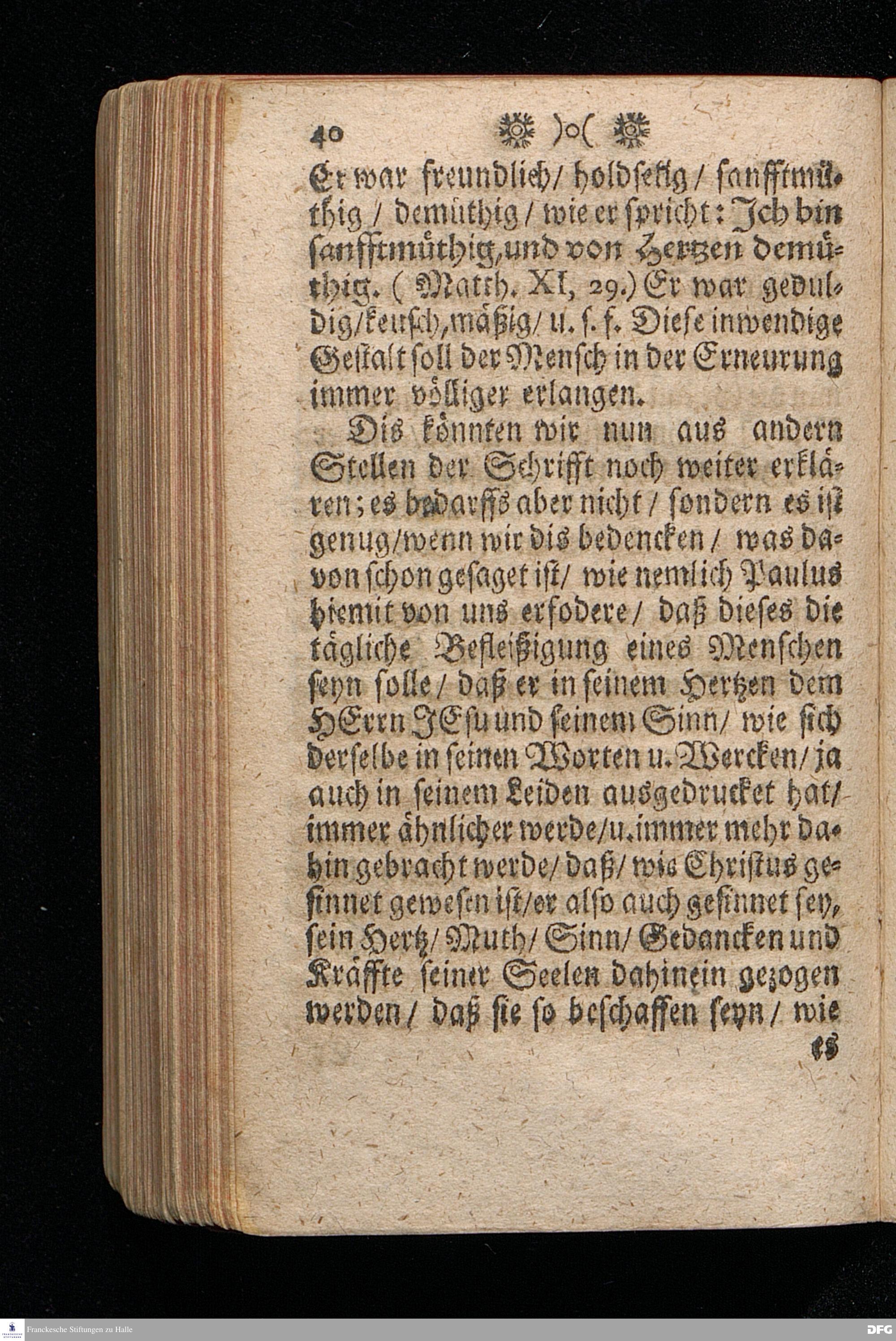 BREVIS INSTITVTIO de STUDIO RENOVATIONIS oder Kurtzer Unterricht von der Erneurung / Wie sich ein jeder Gläubiger derselben nach der Richtschnur Göttlichen Worts befleißigen solle / In einer Predigt über Rom.XII, 1.2. am VII.Soñtage nach Trinit. Anno 1709. In der Schul=Kirche zu Halle ertheilet Von August Hermann Francken / S.Theol.Prof.Ord.und Past. die andere Auflage. HALLE, Im Wäysenhause, 1716.