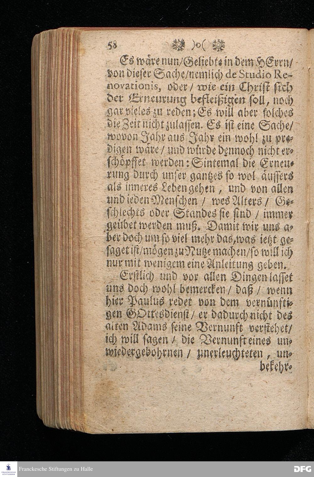 BREVIS INSTITVTIO de STUDIO RENOVATIONIS oder Kurtzer Unterricht von der Erneurung / Wie sich ein jeder Gläubiger derselben nach der Richtschnur Göttlichen Worts befleißigen solle / In einer Predigt über Rom.XII, 1.2. am VII.Soñtage nach Trinit. Anno 1709. In der Schul=Kirche zu Halle ertheilet Von August Hermann Francken / S.Theol.Prof.Ord.und Past. die andere Auflage. HALLE, Im Wäysenhause, 1716.