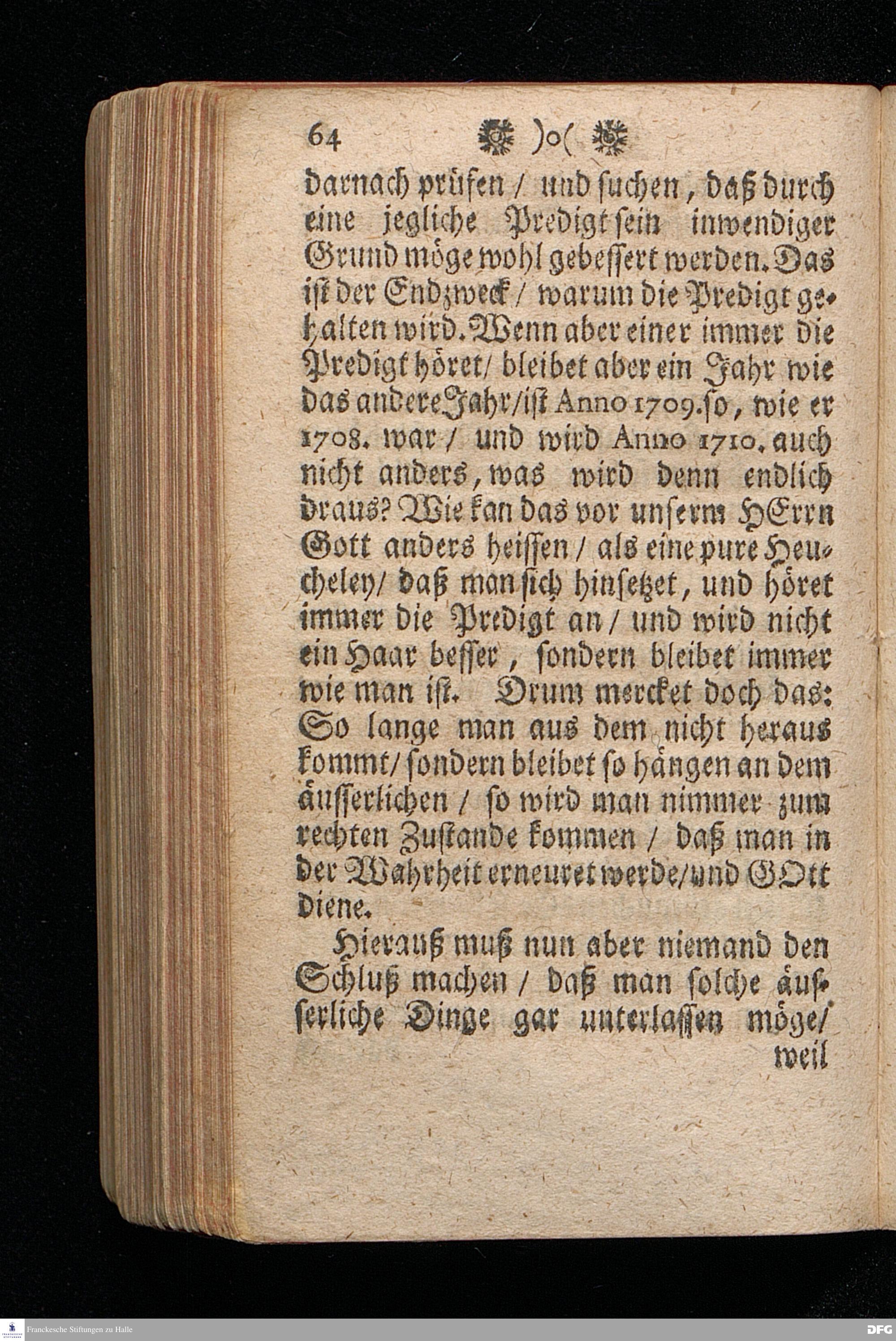 BREVIS INSTITVTIO de STUDIO RENOVATIONIS oder Kurtzer Unterricht von der Erneurung / Wie sich ein jeder Gläubiger derselben nach der Richtschnur Göttlichen Worts befleißigen solle / In einer Predigt über Rom.XII, 1.2. am VII.Soñtage nach Trinit. Anno 1709. In der Schul=Kirche zu Halle ertheilet Von August Hermann Francken / S.Theol.Prof.Ord.und Past. die andere Auflage. HALLE, Im Wäysenhause, 1716.