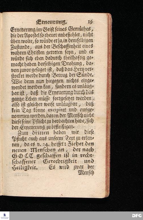 Die Tägliche Erneurung / I) Nach der uns obliegenden Pflicht, II) Nach ihrer wahren Beschaffenheit, III) Nach denen dazu dienlichen Mitteln. Aus der Epistolischen Lection Ephes.IV, 22-28. Am XIX.Sonnt.nach Trinit. Anno MDCCXIII. In der Schul=Kirche zu Halle vorgestellet von August Hermann Francken / S.Theol.Prof.Ord.Past.Vlric.& Scholarcha. Andere Auflage. HALLE, In Verlegung des Wäysen=Hauses. MDCCXXII.