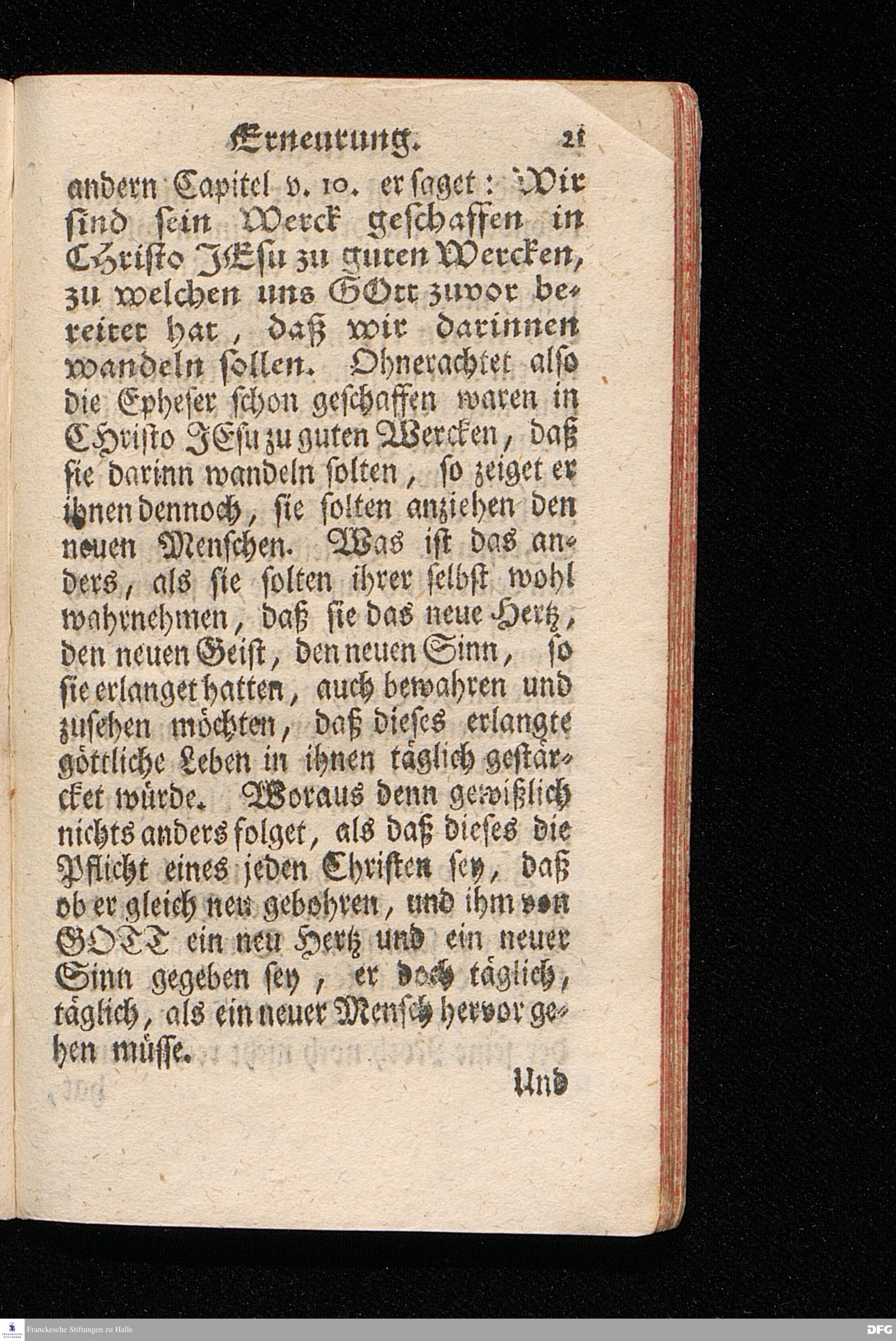 Die Tägliche Erneurung / I) Nach der uns obliegenden Pflicht, II) Nach ihrer wahren Beschaffenheit, III) Nach denen dazu dienlichen Mitteln. Aus der Epistolischen Lection Ephes.IV, 22-28. Am XIX.Sonnt.nach Trinit. Anno MDCCXIII. In der Schul=Kirche zu Halle vorgestellet von August Hermann Francken / S.Theol.Prof.Ord.Past.Vlric.& Scholarcha. Andere Auflage. HALLE, In Verlegung des Wäysen=Hauses. MDCCXXII.