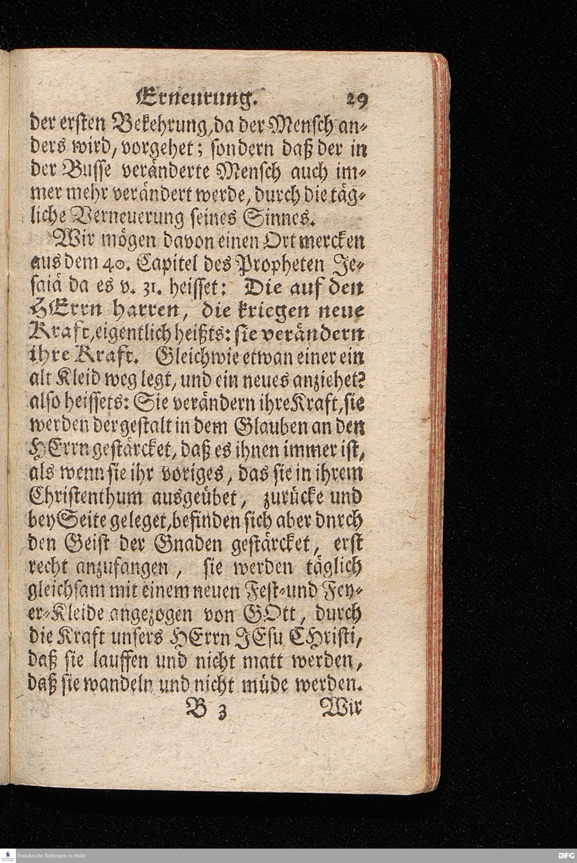 Die Tägliche Erneurung / I) Nach der uns obliegenden Pflicht, II) Nach ihrer wahren Beschaffenheit, III) Nach denen dazu dienlichen Mitteln. Aus der Epistolischen Lection Ephes.IV, 22-28. Am XIX.Sonnt.nach Trinit. Anno MDCCXIII. In der Schul=Kirche zu Halle vorgestellet von August Hermann Francken / S.Theol.Prof.Ord.Past.Vlric.& Scholarcha. Andere Auflage. HALLE, In Verlegung des Wäysen=Hauses. MDCCXXII.
