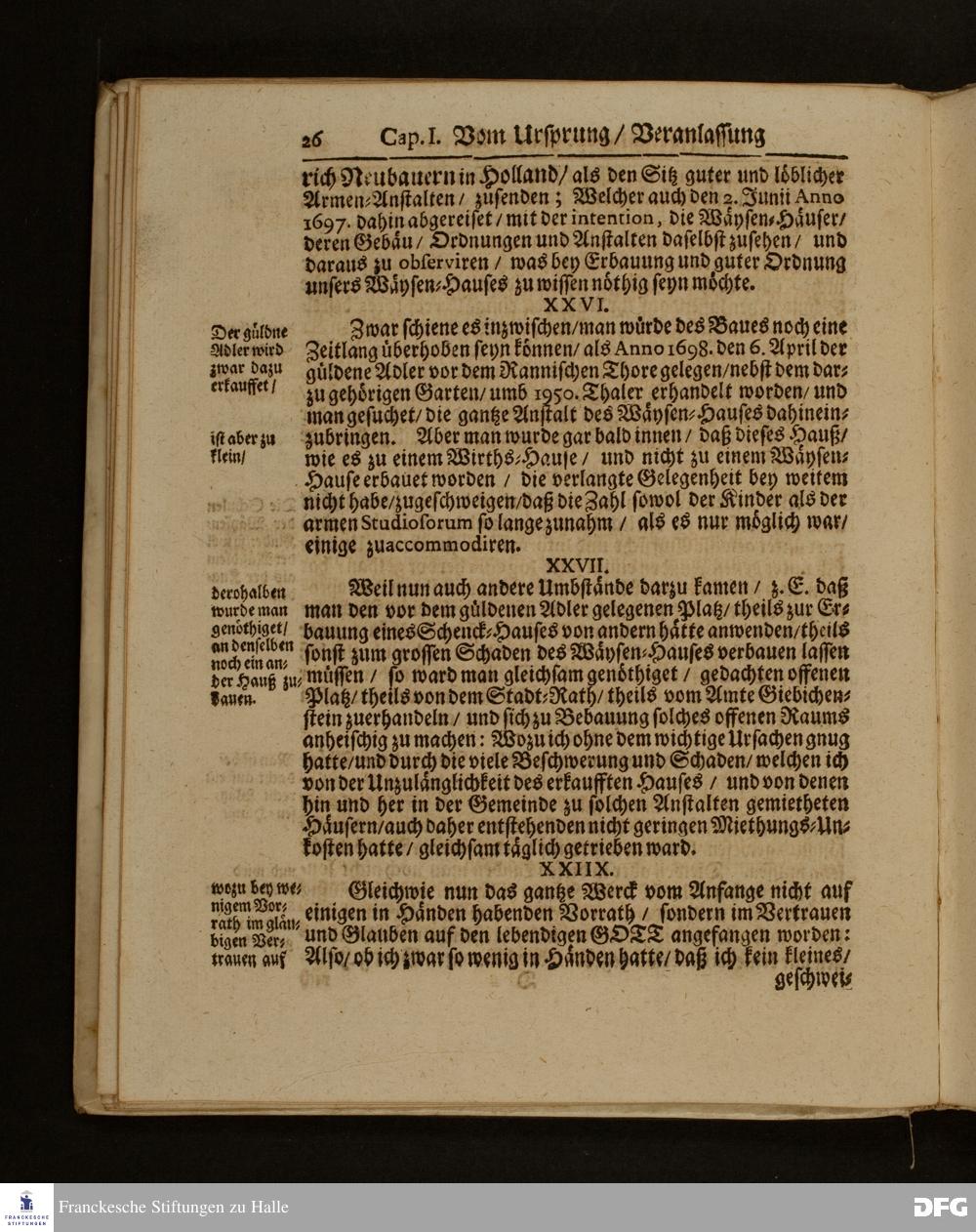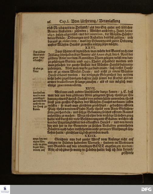 Die Fußstapffen Des noch lebenden und waltenden liebreichen und getreuen GOTTES / Zur Beschämung des Unglaubens / und Stärckung des Glaubens / Durch den Ausführlichen Bericht Vom Wäysen=Hause / Armen=Schulen / und übriger Armen=Verpflegung Zu Glaucha an Halle / Wie selbige fortgesetzet biß Ostern Anno 1701. Entdecket von August Hermann Francken / S.Th.Prof.Ord.und Past. [Spruch.] Mit Königl.Preußischen und Churfl.Brandenb.Privilegio. In Verlegung des Wäysen=Hauses zu Glaucha an Halle / 1701.
