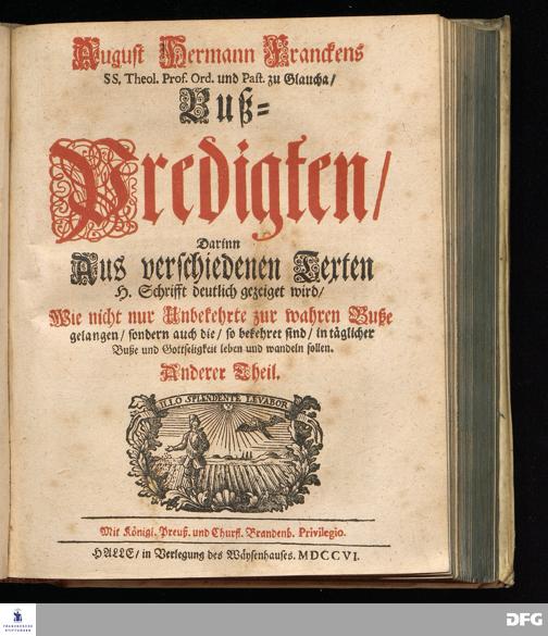August Hermann Franckens SS. Theol. Prof. Ord. und Past. zu Glaucha/ Buß=Predigten/ Darinn Aus verschiedenen Texten H. Schrifft deutlich gezeiget wird/ Wie nicht nur Unbekehrte zur wahren Buße gelangen/ sondern auch die/ so bekehret sind/ in täglicher Buße und Gottseligkeit leben und wandeln sollen. Erster und Anderer Theil; Deren jener vor diesem schon ediret/ und nun auffs neue durchsehen und verbessert ist: dieser aber ietzo zum ersten mal heraus gegeben wird. Mit Königl. Preuß. und Churfl. Brandenb. Privilegio. HALLE/ in Verlegung des Wäysenhauses. MDCCVI