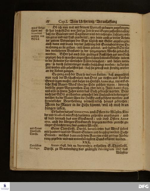 Die Fußstapffen Des noch lebenden und waltenden liebreichen und getreuen GOTTES / Zur Beschämung des Unglaubens / und Stärckung des Glaubens / Durch den Ausführlichen Bericht Vom Wäysen=Hause / Armen=Schulen / und übriger Armen=Verpflegung Zu Glaucha an Halle / Wie selbige fortgesetzet biß Ostern Anno 1701. Entdecket von August Hermann Francken / S.Th.Prof.Ord.und Past. [Spruch.] Mit Königl.Preußischen und Churfl.Brandenb.Privilegio. In Verlegung des Wäysen=Hauses zu Glaucha an Halle / 1701.