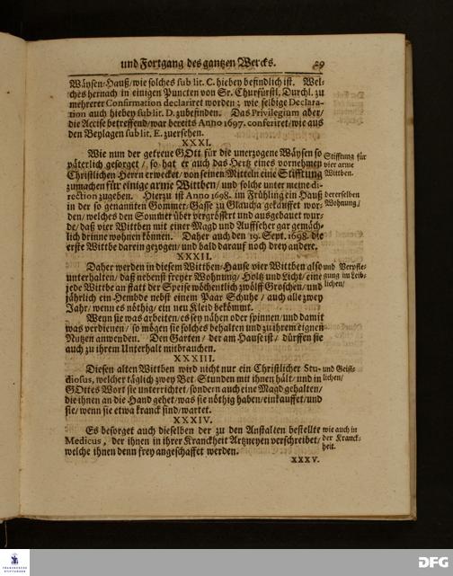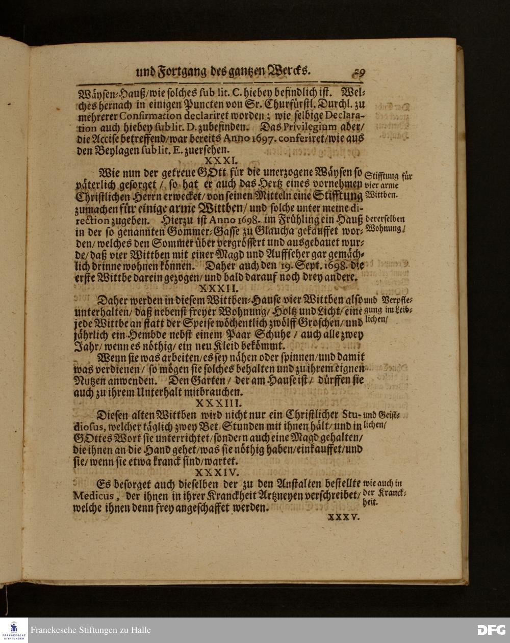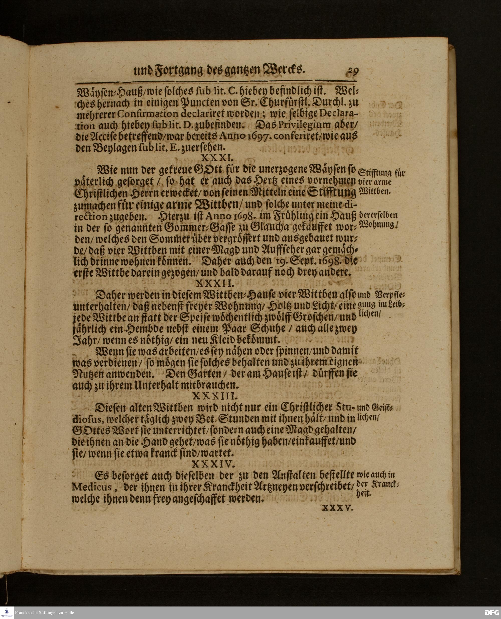Die Fußstapffen Des noch lebenden und waltenden liebreichen und getreuen GOTTES / Zur Beschämung des Unglaubens / und Stärckung des Glaubens / Durch den Ausführlichen Bericht Vom Wäysen=Hause / Armen=Schulen / und übriger Armen=Verpflegung Zu Glaucha an Halle / Wie selbige fortgesetzet biß Ostern Anno 1701. Entdecket von August Hermann Francken / S.Th.Prof.Ord.und Past. [Spruch.] Mit Königl.Preußischen und Churfl.Brandenb.Privilegio. In Verlegung des Wäysen=Hauses zu Glaucha an Halle / 1701.
