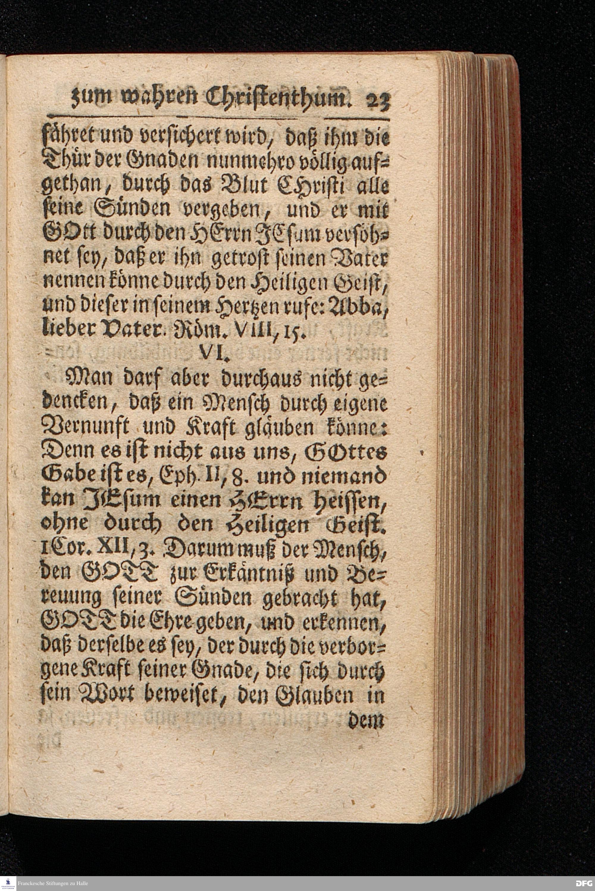 Die Lehre Vom Anfang Christliches Lebens / Bestehend in vier Theilen: I. In einer gründlichen Anleitung zu wahrer Busse und Glauben an GOTT. II. In einem einfältigen Unterricht, wie man die H.Schrift zu seiner wahren Erbauung lesen solle. III. In einer Schriftmäßigen Anweisung recht und GOTT gefällig zu beten. IV. In einer kurtzen Prüfung / ob man den wahren lebendigen Glauben an CHristum habe oder nicht. Die XIII.Auflage. HALLE, In Verlegung des Wäysenhauses, 1730.