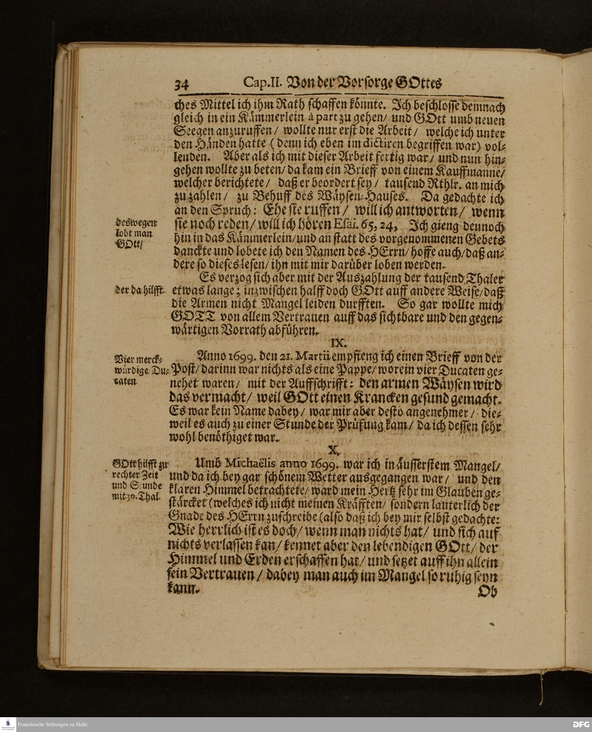Die Fußstapffen Des noch lebenden und waltenden liebreichen und getreuen GOTTES / Zur Beschämung des Unglaubens / und Stärckung des Glaubens / Durch den Ausführlichen Bericht Vom Wäysen=Hause / Armen=Schulen / und übriger Armen=Verpflegung Zu Glaucha an Halle / Wie selbige fortgesetzet biß Ostern Anno 1701. Entdecket von August Hermann Francken / S.Th.Prof.Ord.und Past. [Spruch.] Mit Königl.Preußischen und Churfl.Brandenb.Privilegio. In Verlegung des Wäysen=Hauses zu Glaucha an Halle / 1701.