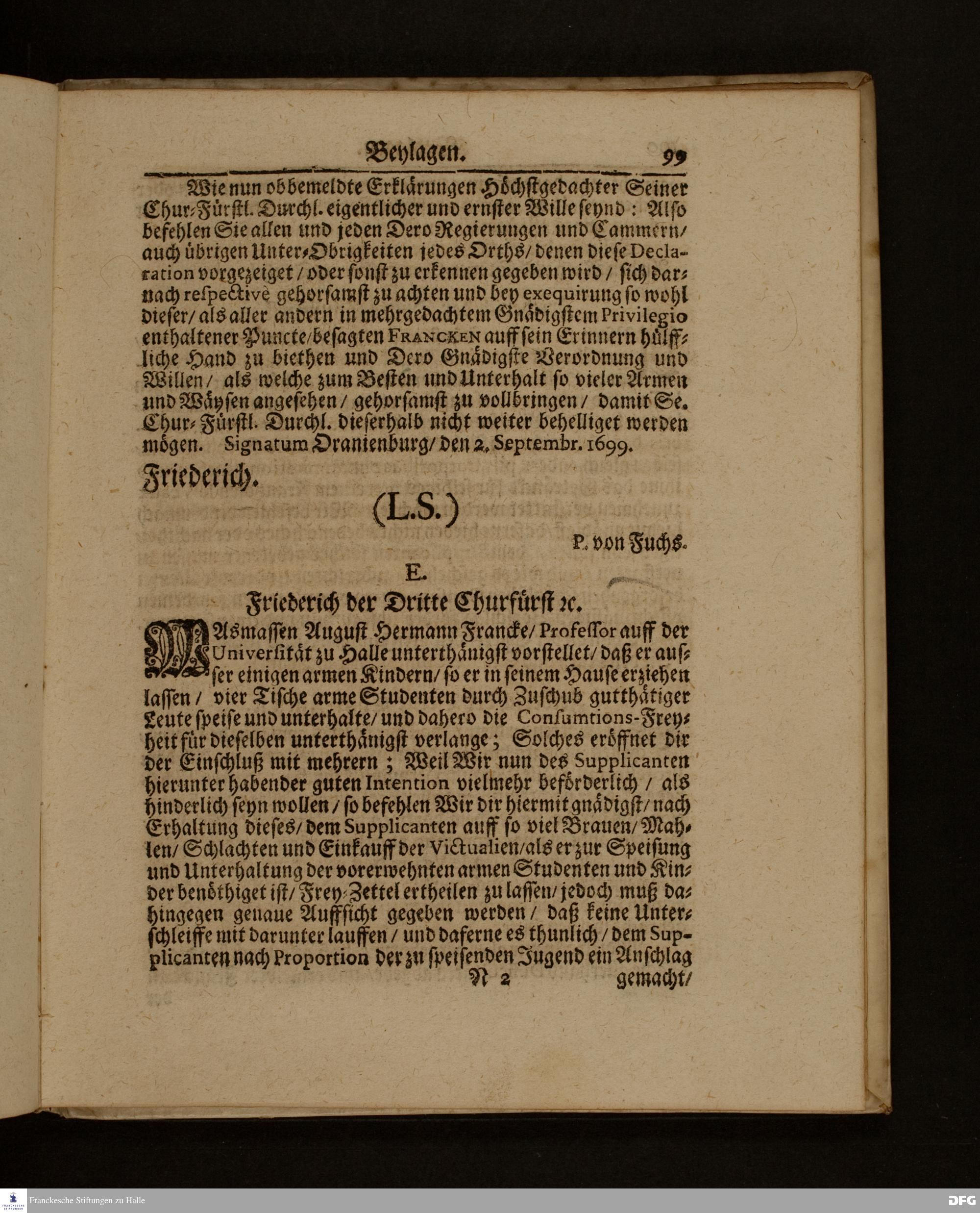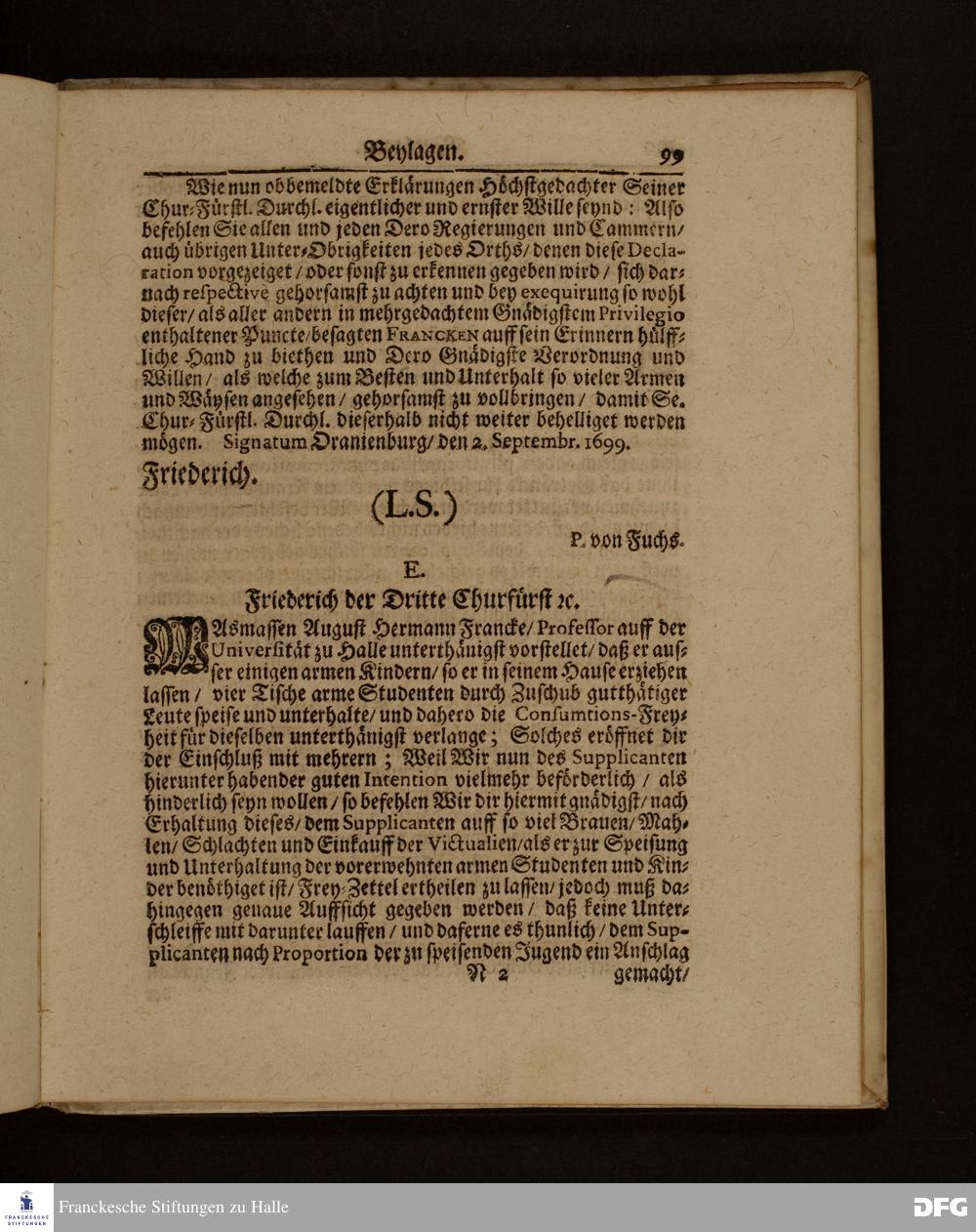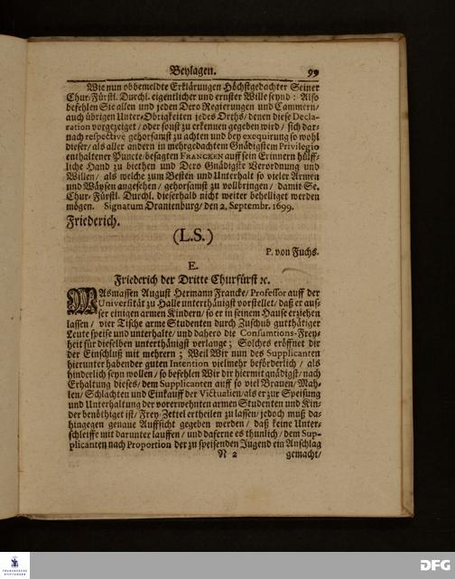 Die Fußstapffen Des noch lebenden und waltenden liebreichen und getreuen GOTTES / Zur Beschämung des Unglaubens / und Stärckung des Glaubens / Durch den Ausführlichen Bericht Vom Wäysen=Hause / Armen=Schulen / und übriger Armen=Verpflegung Zu Glaucha an Halle / Wie selbige fortgesetzet biß Ostern Anno 1701. Entdecket von August Hermann Francken / S.Th.Prof.Ord.und Past. [Spruch.] Mit Königl.Preußischen und Churfl.Brandenb.Privilegio. In Verlegung des Wäysen=Hauses zu Glaucha an Halle / 1701.