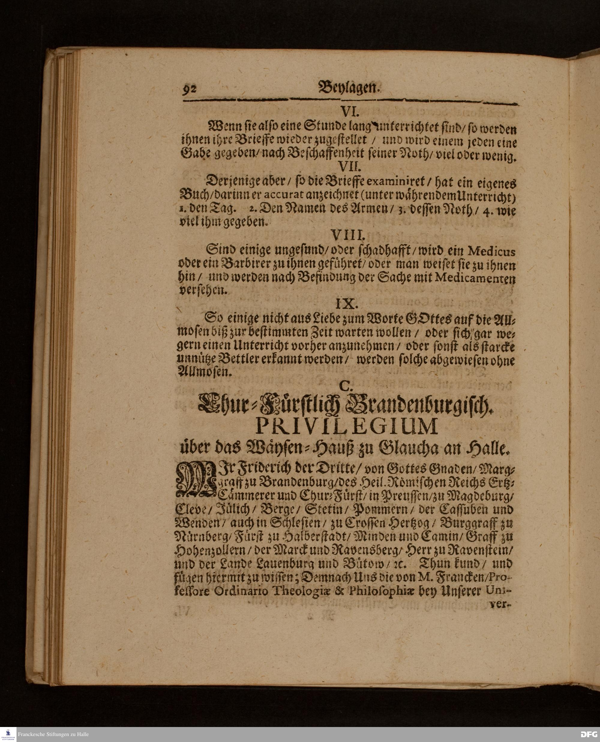 Die Fußstapffen Des noch lebenden und waltenden liebreichen und getreuen GOTTES / Zur Beschämung des Unglaubens / und Stärckung des Glaubens / Durch den Ausführlichen Bericht Vom Wäysen=Hause / Armen=Schulen / und übriger Armen=Verpflegung Zu Glaucha an Halle / Wie selbige fortgesetzet biß Ostern Anno 1701. Entdecket von August Hermann Francken / S.Th.Prof.Ord.und Past. [Spruch.] Mit Königl.Preußischen und Churfl.Brandenb.Privilegio. In Verlegung des Wäysen=Hauses zu Glaucha an Halle / 1701.