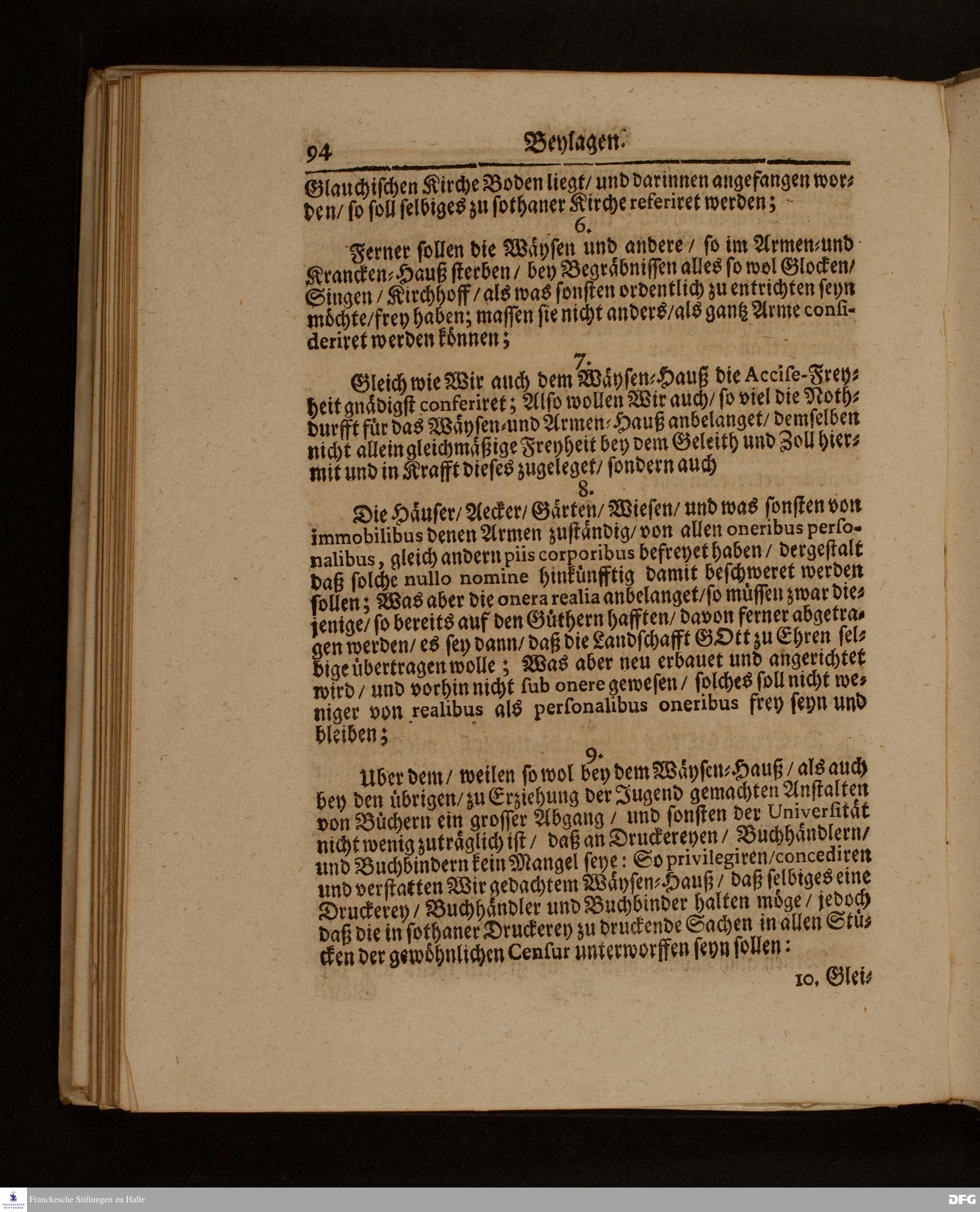 Die Fußstapffen Des noch lebenden und waltenden liebreichen und getreuen GOTTES / Zur Beschämung des Unglaubens / und Stärckung des Glaubens / Durch den Ausführlichen Bericht Vom Wäysen=Hause / Armen=Schulen / und übriger Armen=Verpflegung Zu Glaucha an Halle / Wie selbige fortgesetzet biß Ostern Anno 1701. Entdecket von August Hermann Francken / S.Th.Prof.Ord.und Past. [Spruch.] Mit Königl.Preußischen und Churfl.Brandenb.Privilegio. In Verlegung des Wäysen=Hauses zu Glaucha an Halle / 1701.