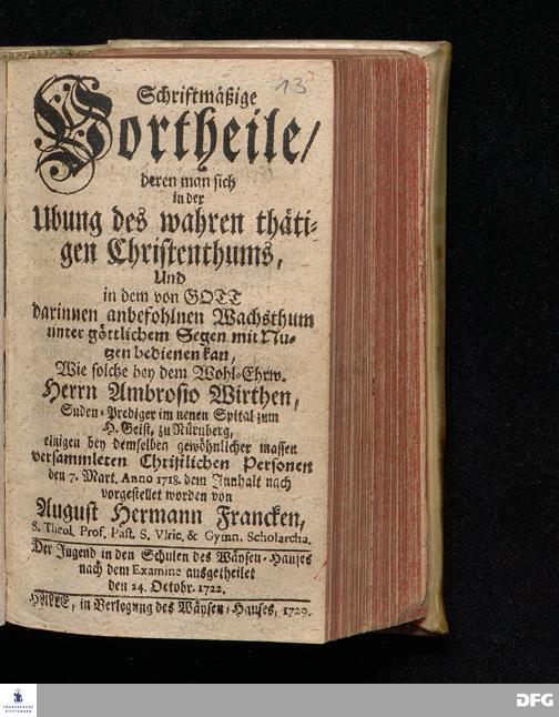 Schriftmäßige Vortheile / deren man sich in der Ubung des wahren thätigen Christenthums, Und in dem von GOTT darinnen anbefohlnen Wachsthum unter göttlichem Segen mit Nutzen bedienen kan, Wie solche bey dem Wohl=Ehrw. Herrn Ambrosio Wirthen, Suden=Prediger im neuen Spital zum H.Geist, zu Nürnberg, einigen bey demselben gewöhnlicher massen versammleten Christlichen Personen den 7.Mart.Anno 1718.dem Innhalt nach vorgestellet worden von August Hermann Francken, S.Theol.Prof.Past.S.Vlric.& Gymn.Scholarcha. Der Jugend in den Schulen des Wäysen=Hauses nach dem Examine ausgetheilet den 24.Octobr.1722. HALLE, in Verlegung des Wäysen=Hauses, 1729.