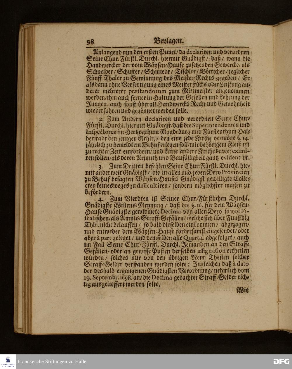 Die Fußstapffen Des noch lebenden und waltenden liebreichen und getreuen GOTTES / Zur Beschämung des Unglaubens / und Stärckung des Glaubens / Durch den Ausführlichen Bericht Vom Wäysen=Hause / Armen=Schulen / und übriger Armen=Verpflegung Zu Glaucha an Halle / Wie selbige fortgesetzet biß Ostern Anno 1701. Entdecket von August Hermann Francken / S.Th.Prof.Ord.und Past. [Spruch.] Mit Königl.Preußischen und Churfl.Brandenb.Privilegio. In Verlegung des Wäysen=Hauses zu Glaucha an Halle / 1701.