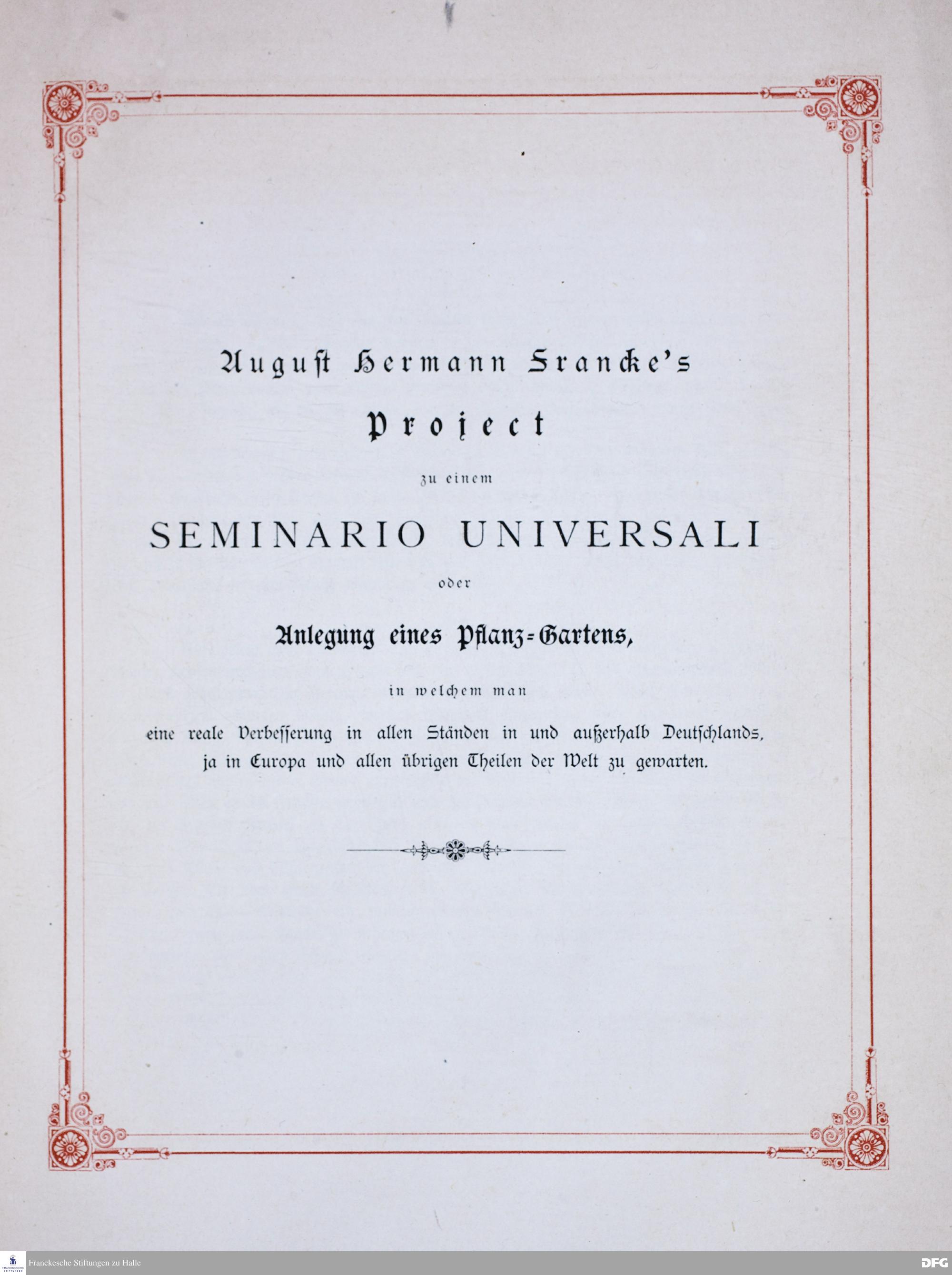 August Hermann Francke's Project zu einem SEMINARIO UNIVERSALI oder Anlegung eines Pflanz=Gartens, in welchem man eine reale Verbesserung in allen Ständen in und außerhalb Deutschlands, ja in Europa und allen übrigen Theilen der Welt zu gewarten.