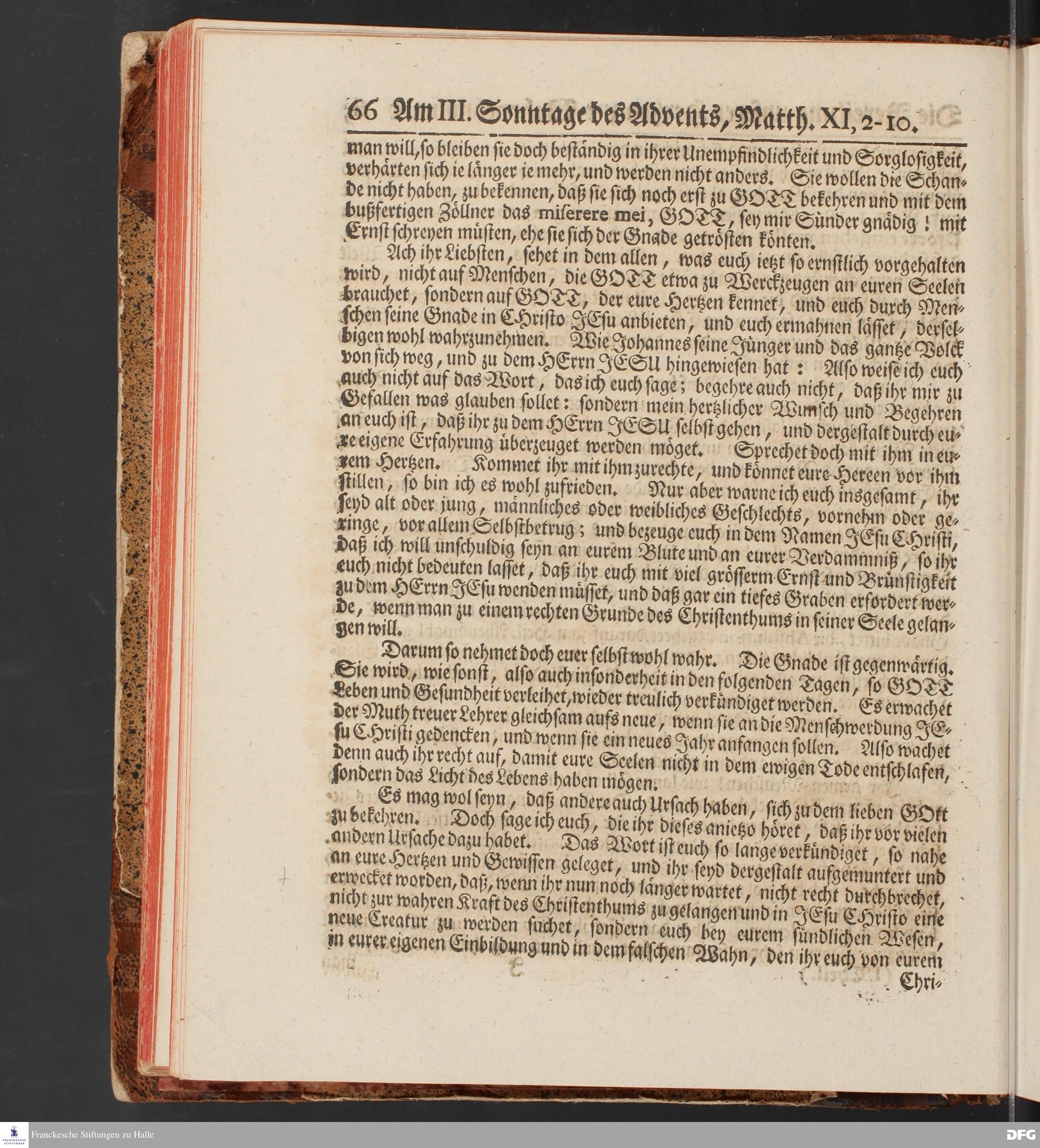August Hermann Franckens, S.Theol.Prof.und Past. Sonn= und Fest=Tags=Predigten / Welche Theils in Halle, theils an verschiedenen auswärtigen Oertern, von wichtigen und auserlesenen Materien gehalten worden, Nebst Vorbereitung auf die hohen Feste und nützlichen Registern. Dritte Auflage. HALLE, gedruckt und verlegt im Wäysen=Hause MDCCXL. Mit Königl.Preuß.und Churfl.Brandenb.Privileg.