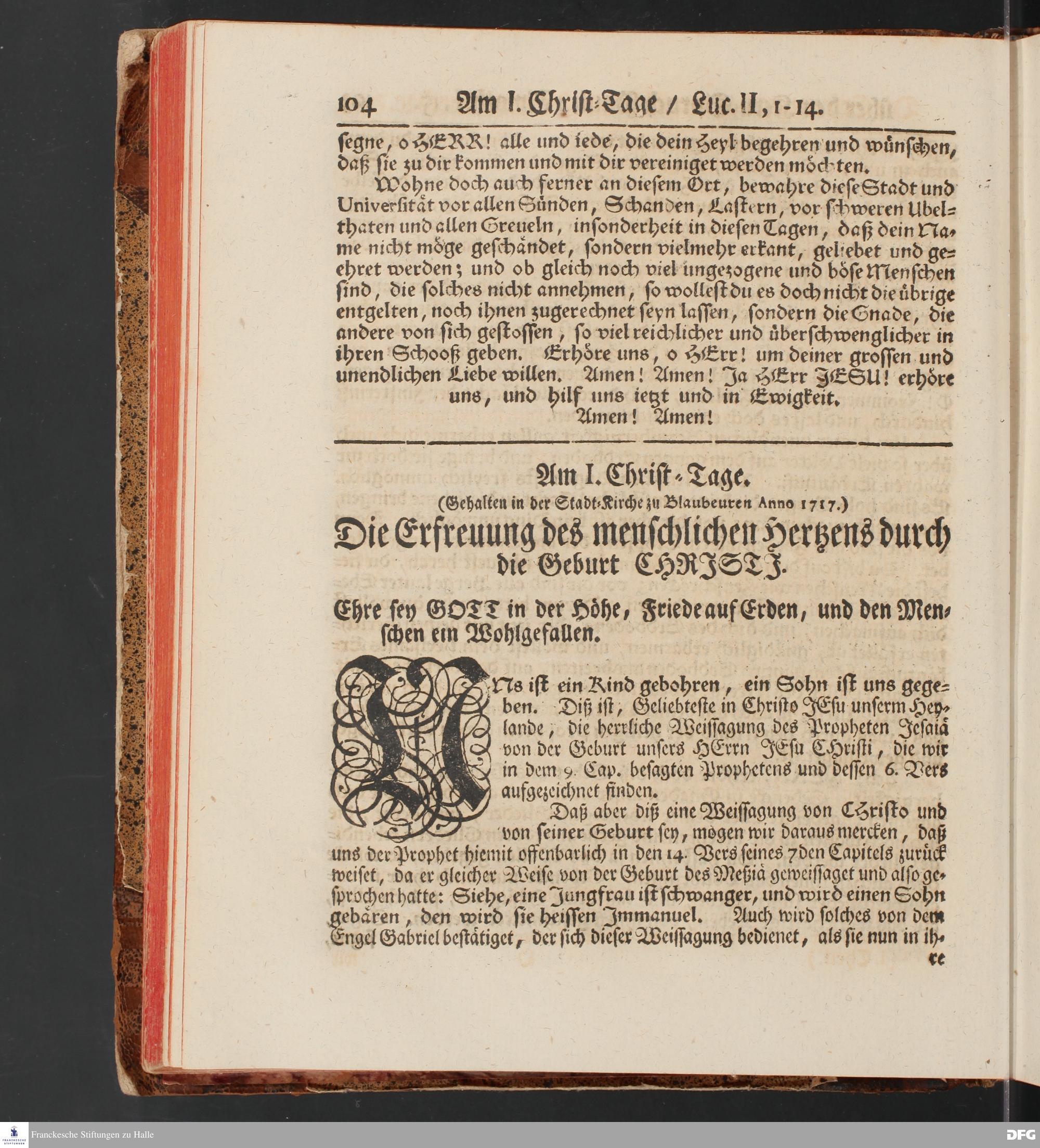 August Hermann Franckens, S.Theol.Prof.und Past. Sonn= und Fest=Tags=Predigten / Welche Theils in Halle, theils an verschiedenen auswärtigen Oertern, von wichtigen und auserlesenen Materien gehalten worden, Nebst Vorbereitung auf die hohen Feste und nützlichen Registern. Dritte Auflage. HALLE, gedruckt und verlegt im Wäysen=Hause MDCCXL. Mit Königl.Preuß.und Churfl.Brandenb.Privileg.