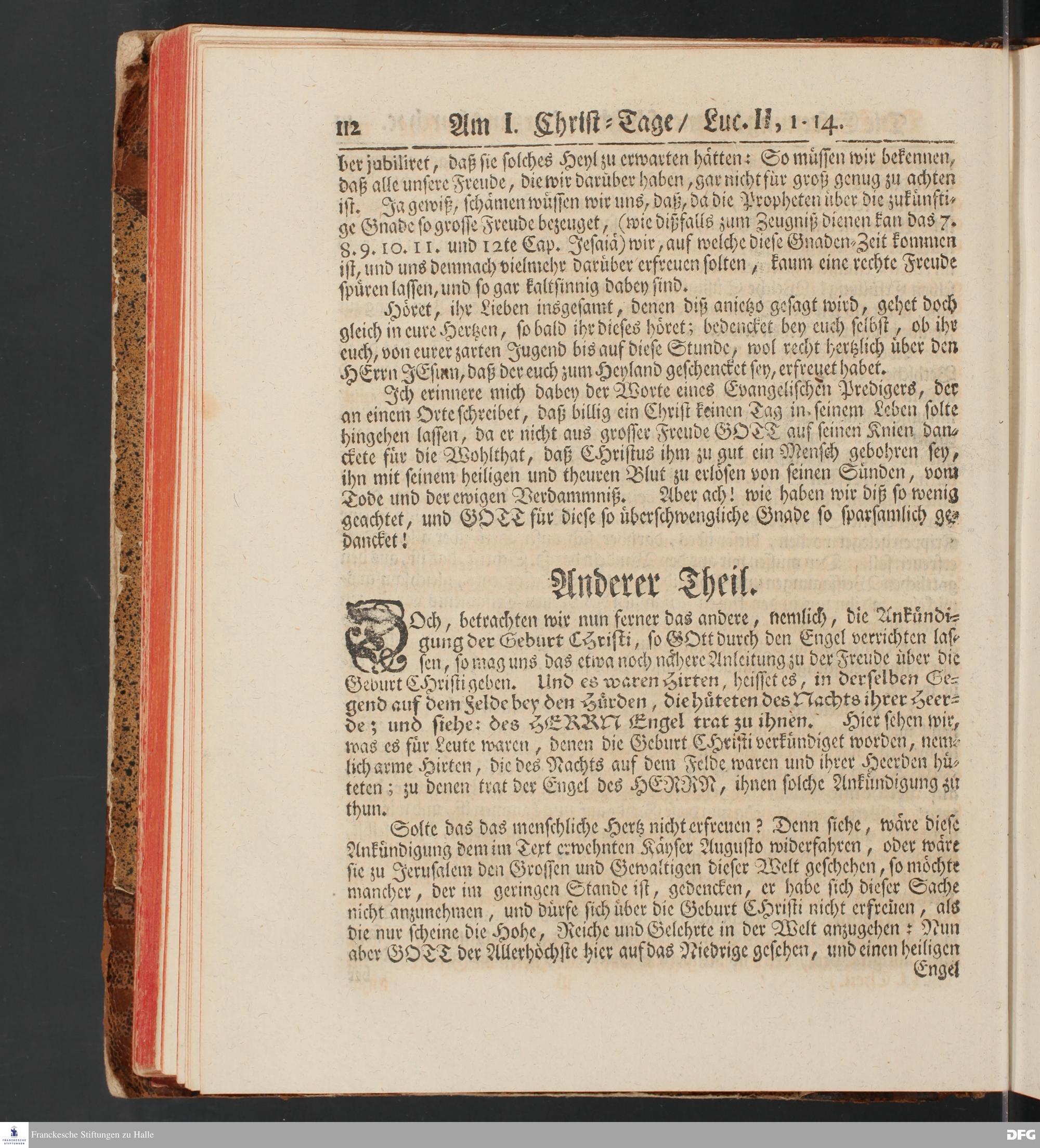 August Hermann Franckens, S.Theol.Prof.und Past. Sonn= und Fest=Tags=Predigten / Welche Theils in Halle, theils an verschiedenen auswärtigen Oertern, von wichtigen und auserlesenen Materien gehalten worden, Nebst Vorbereitung auf die hohen Feste und nützlichen Registern. Dritte Auflage. HALLE, gedruckt und verlegt im Wäysen=Hause MDCCXL. Mit Königl.Preuß.und Churfl.Brandenb.Privileg.