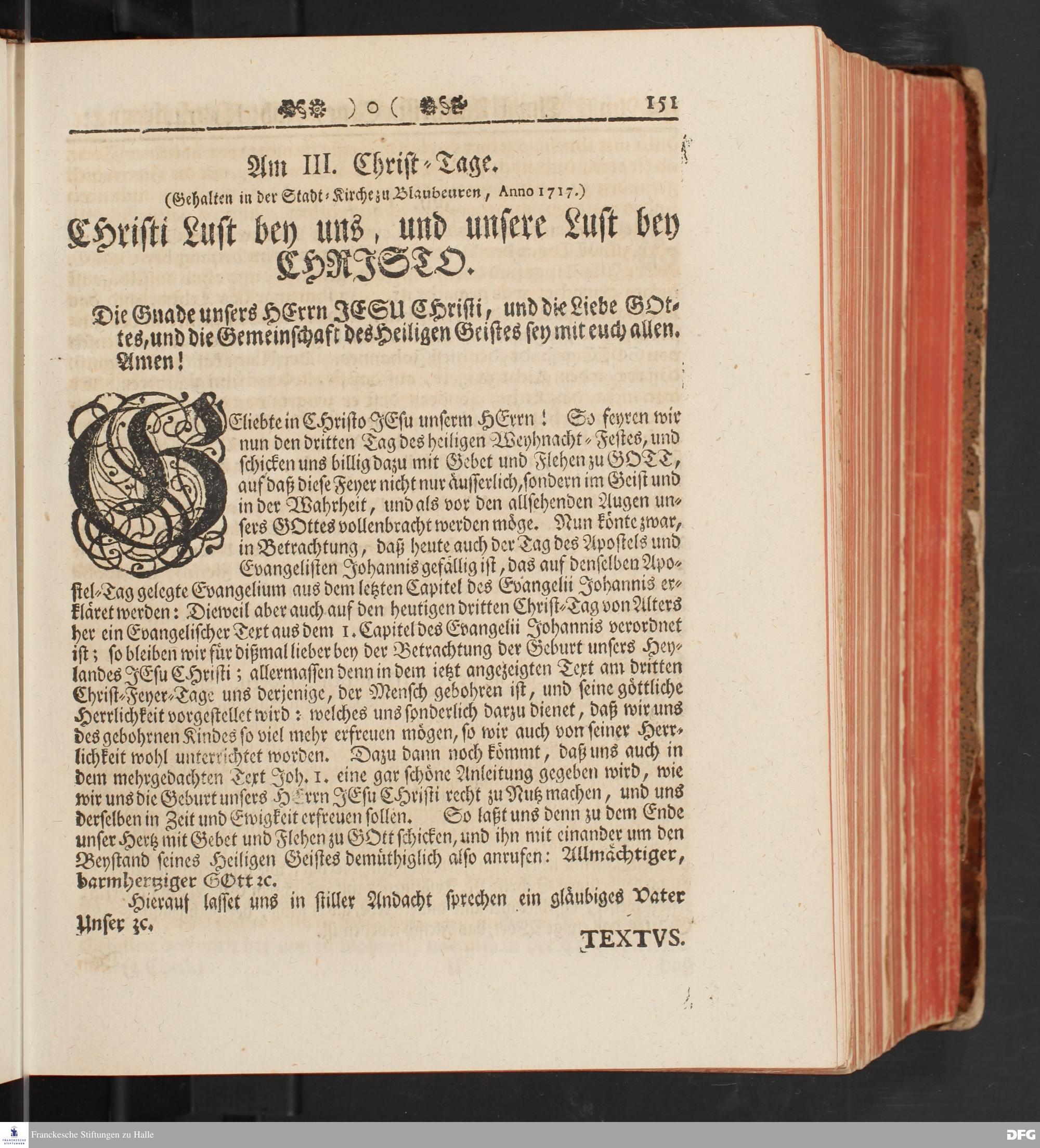 August Hermann Franckens, S.Theol.Prof.und Past. Sonn= und Fest=Tags=Predigten / Welche Theils in Halle, theils an verschiedenen auswärtigen Oertern, von wichtigen und auserlesenen Materien gehalten worden, Nebst Vorbereitung auf die hohen Feste und nützlichen Registern. Dritte Auflage. HALLE, gedruckt und verlegt im Wäysen=Hause MDCCXL. Mit Königl.Preuß.und Churfl.Brandenb.Privileg.