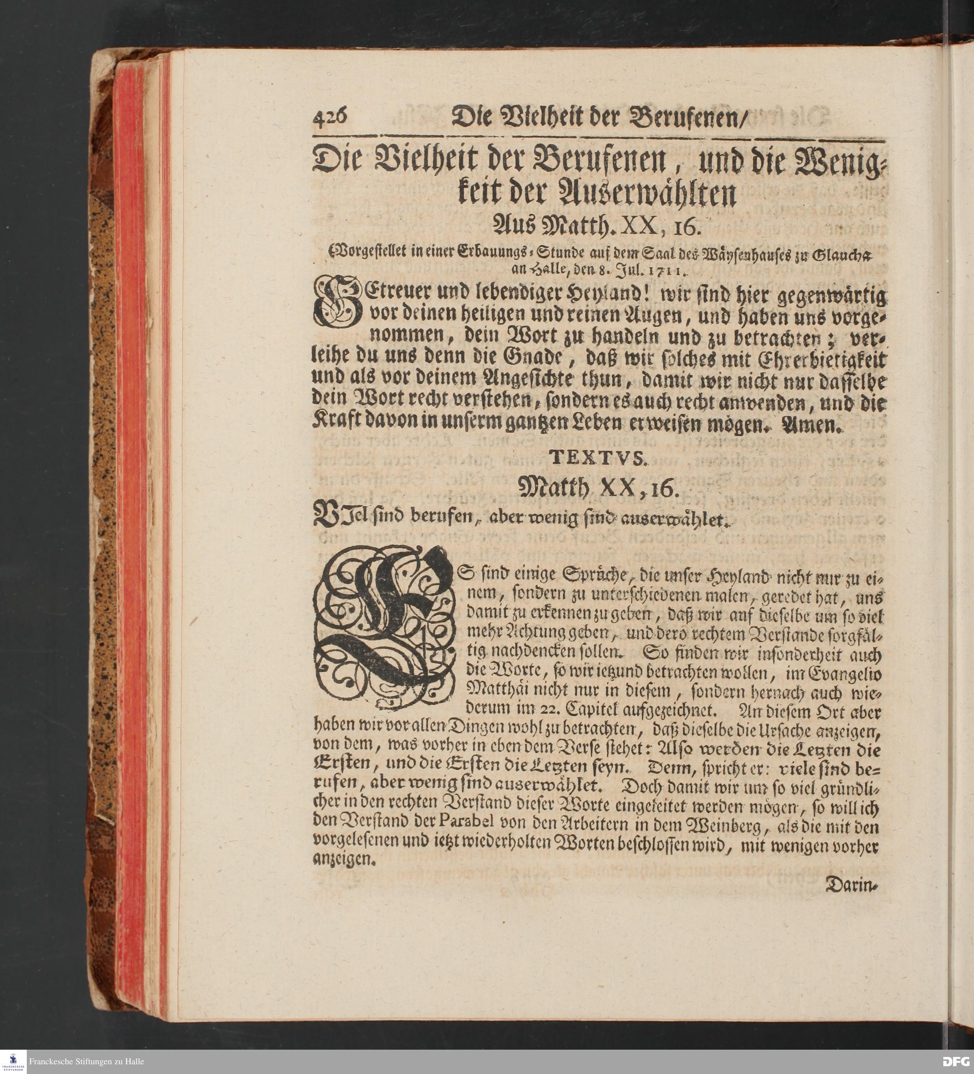August Hermann Franckens, S.Theol.Prof.und Past. Sonn= und Fest=Tags=Predigten / Welche Theils in Halle, theils an verschiedenen auswärtigen Oertern, von wichtigen und auserlesenen Materien gehalten worden, Nebst Vorbereitung auf die hohen Feste und nützlichen Registern. Dritte Auflage. HALLE, gedruckt und verlegt im Wäysen=Hause MDCCXL. Mit Königl.Preuß.und Churfl.Brandenb.Privileg.
