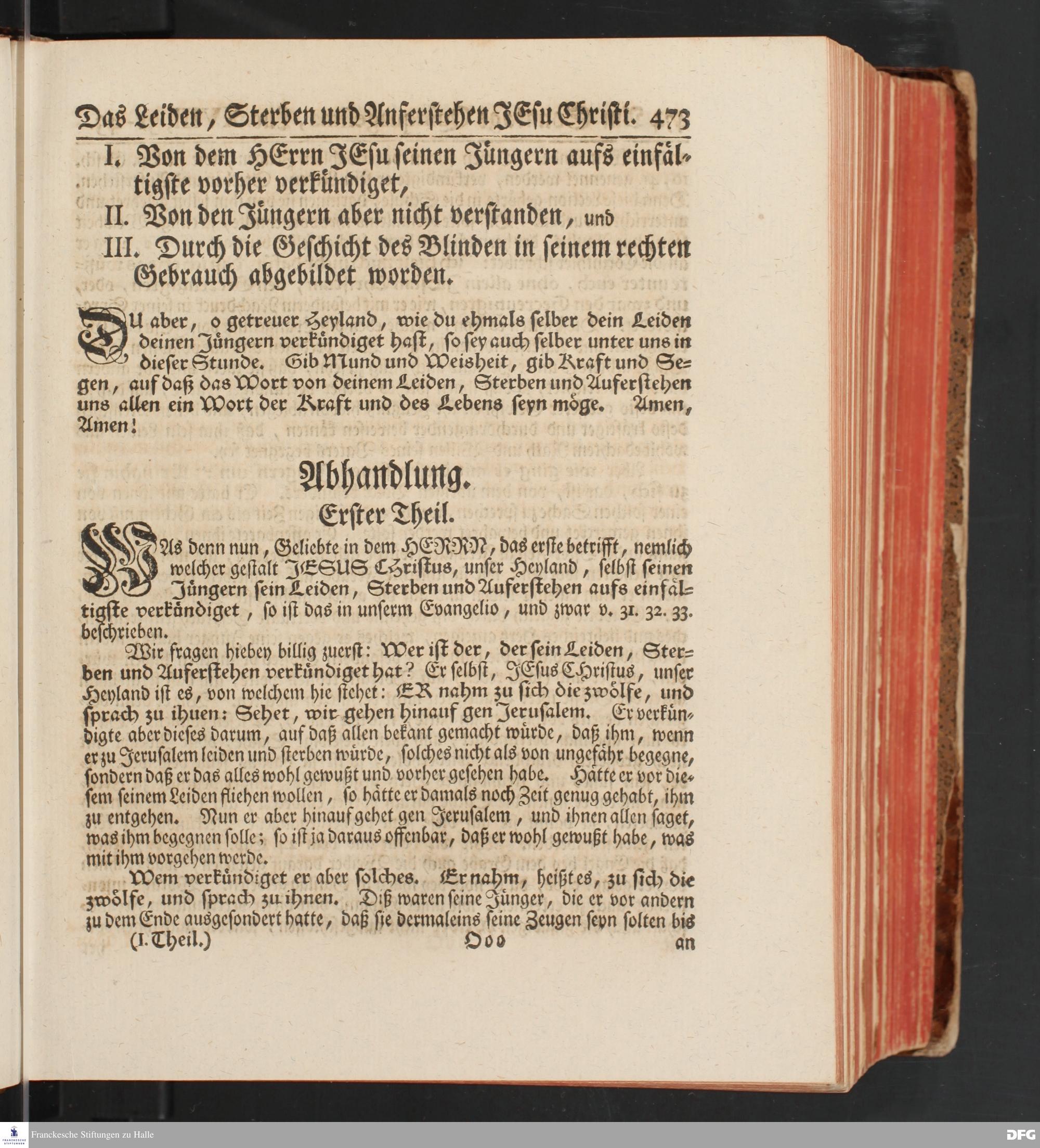 August Hermann Franckens, S.Theol.Prof.und Past. Sonn= und Fest=Tags=Predigten / Welche Theils in Halle, theils an verschiedenen auswärtigen Oertern, von wichtigen und auserlesenen Materien gehalten worden, Nebst Vorbereitung auf die hohen Feste und nützlichen Registern. Dritte Auflage. HALLE, gedruckt und verlegt im Wäysen=Hause MDCCXL. Mit Königl.Preuß.und Churfl.Brandenb.Privileg.