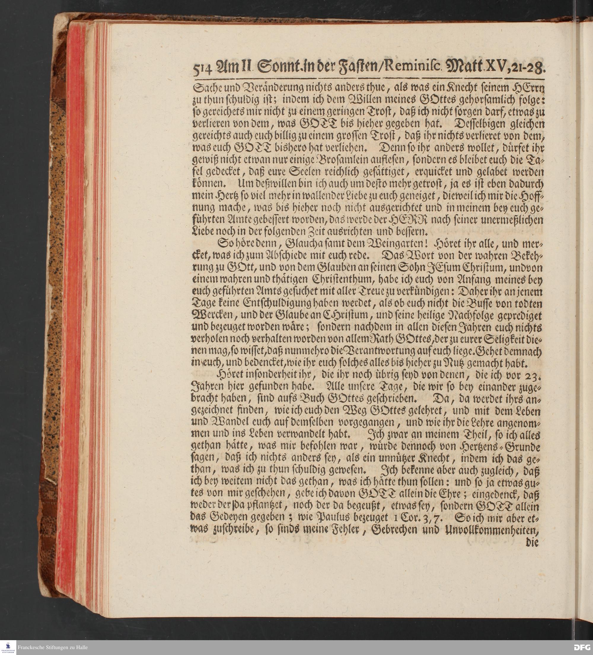 August Hermann Franckens, S.Theol.Prof.und Past. Sonn= und Fest=Tags=Predigten / Welche Theils in Halle, theils an verschiedenen auswärtigen Oertern, von wichtigen und auserlesenen Materien gehalten worden, Nebst Vorbereitung auf die hohen Feste und nützlichen Registern. Dritte Auflage. HALLE, gedruckt und verlegt im Wäysen=Hause MDCCXL. Mit Königl.Preuß.und Churfl.Brandenb.Privileg.