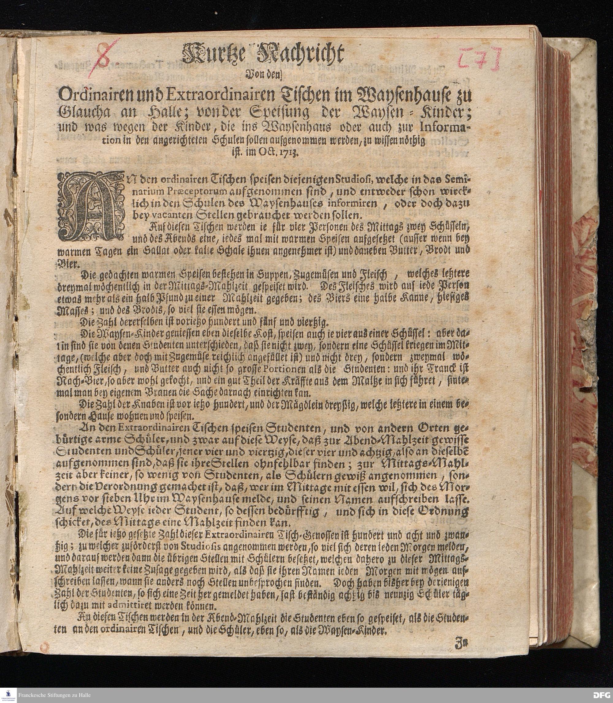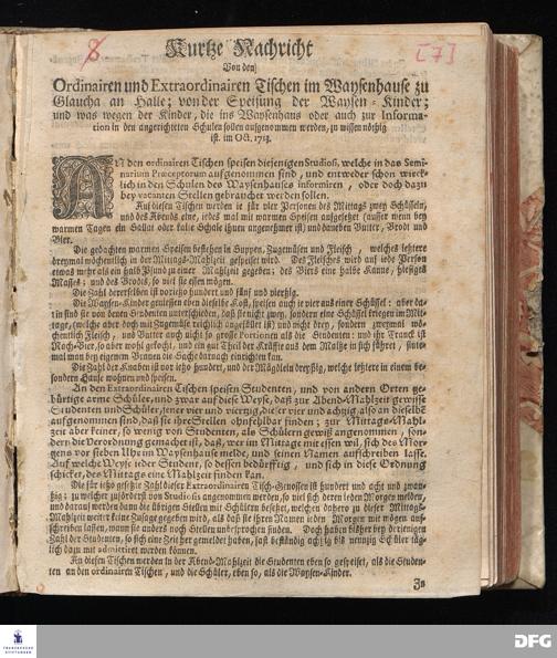 Kurtze Nachricht Von den Ordinairen und Extraordinairen Tischen im Waysenhause zu Glaucha an Halle; von der Speisung der Waysen=Kinder; und was wegen der Kinder, die ins Waysenhaus oder auch zur Information in den angerichteten Schulen sollen aufgenommen werden, zu wissen nöthig ist. im Oct.1713. [Einblattdruck]