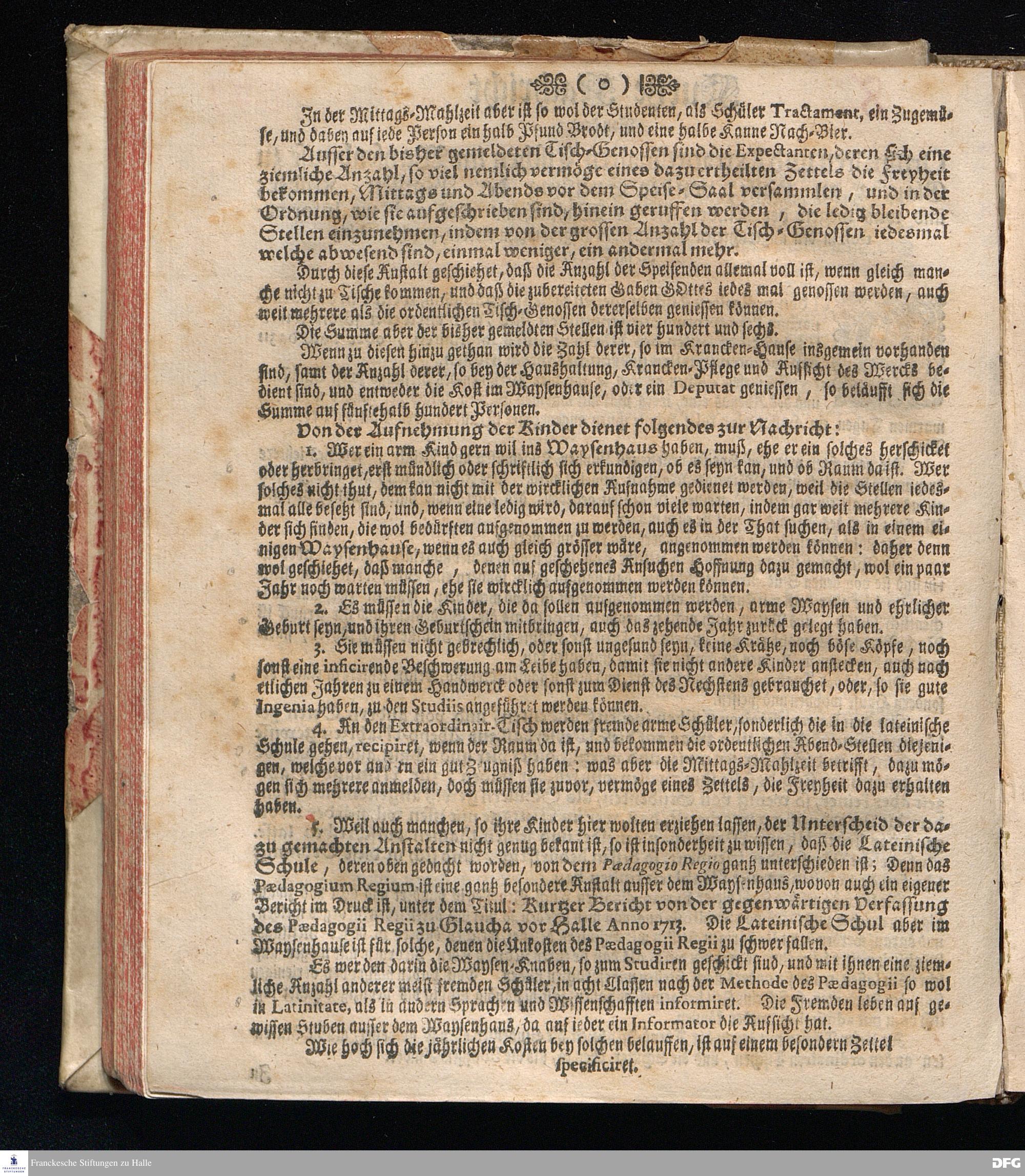 Kurtze Nachricht Von den Ordinairen und Extraordinairen Tischen im Waysenhause zu Glaucha an Halle; von der Speisung der Waysen=Kinder; und was wegen der Kinder, die ins Waysenhaus oder auch zur Information in den angerichteten Schulen sollen aufgenommen werden, zu wissen nöthig ist. im Oct.1713. [Einblattdruck]