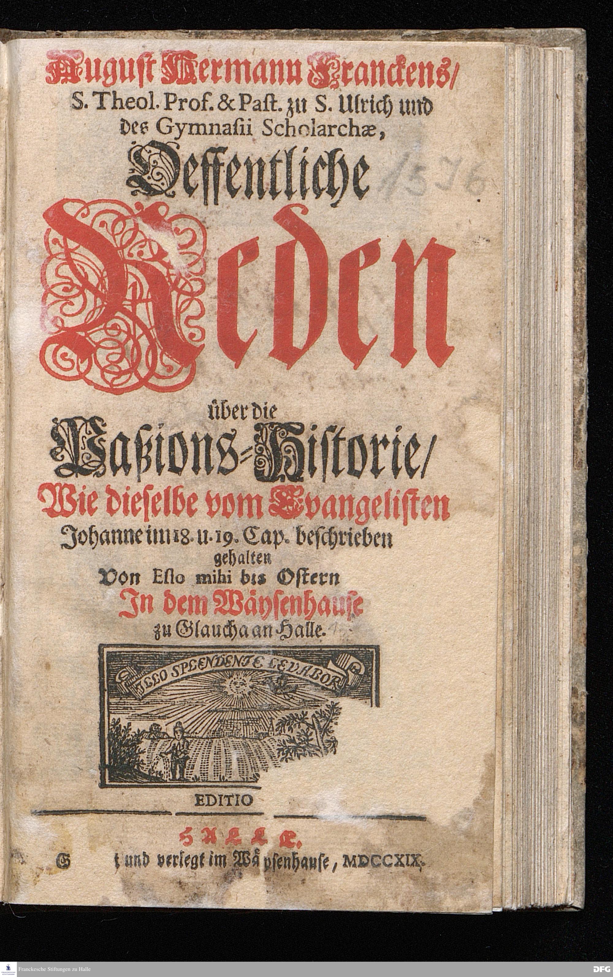 August Hermann Franckens / S.Theol.Prof.& Past.zu S.Ulrich und des Gymnasii Scholarchæ, Oeffentliche Reden über die Paßions=Historie / Wie dieselbe vom Evangelisten Johanne im 18.u.19. Cap. beschrieben ist / gehalten Von Esto mihi bis Ostern 1716. In dem Wäysenhause zu Glaucha an Halle. EDITIO II. HALLE / Gedruckt und verlegt im Wäysenhause MDCCXIX.